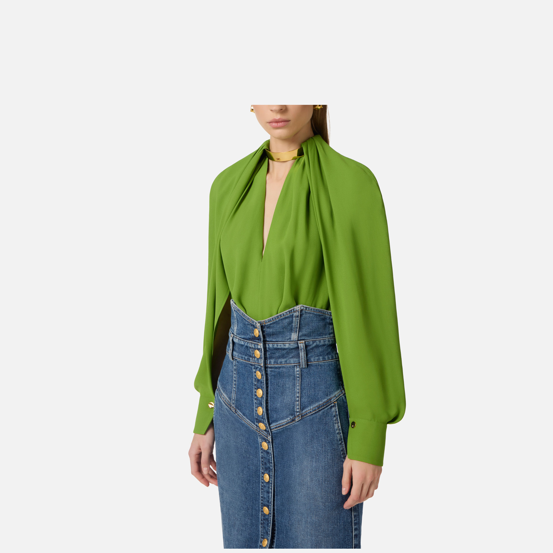 Bluză Elisabetta Franchibluză din georgette de vâscoză cu design sofisticat și fluid, ideală pentru ținute elegante și rafinate. Mânecile lungi stil pelerină și decolteul adânc creează o siluetă feminină și modernă, completată de un detaliu statement.