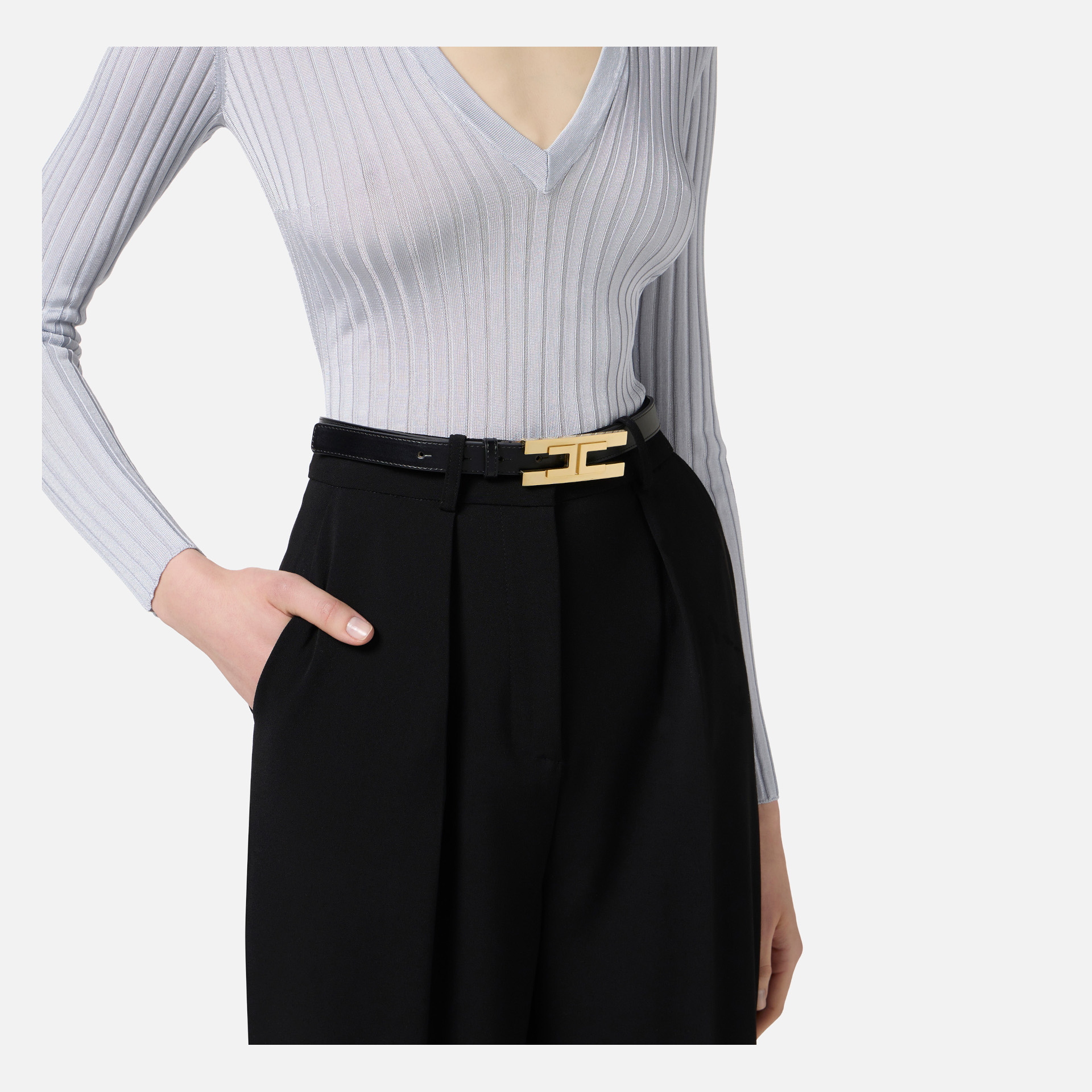 Completează-ți ținutele cu această curea Elisabetta Franchi, un accesoriu versatil și elegant, ce aduce un plus de rafinament fiecărei apariții. Realizată din materiale de calitate superioară, cureaua este definită de catarama metalică aurie cu logo-ul emblematic al brandului, un detaliu sofisticat ce transformă un obiect practic într-o piesă statement.