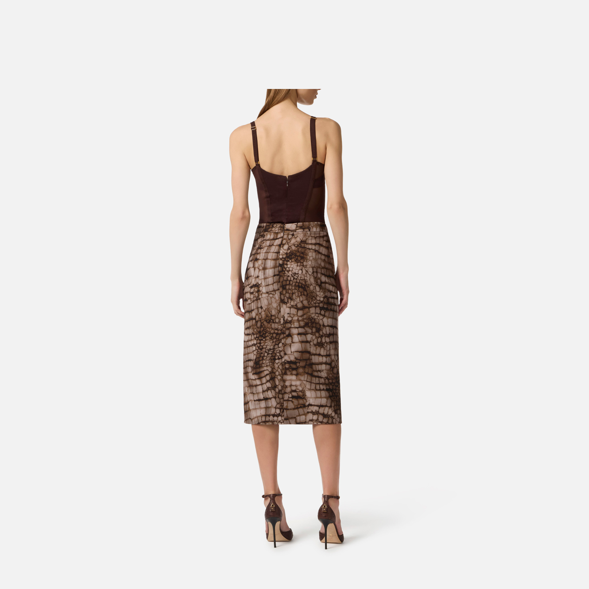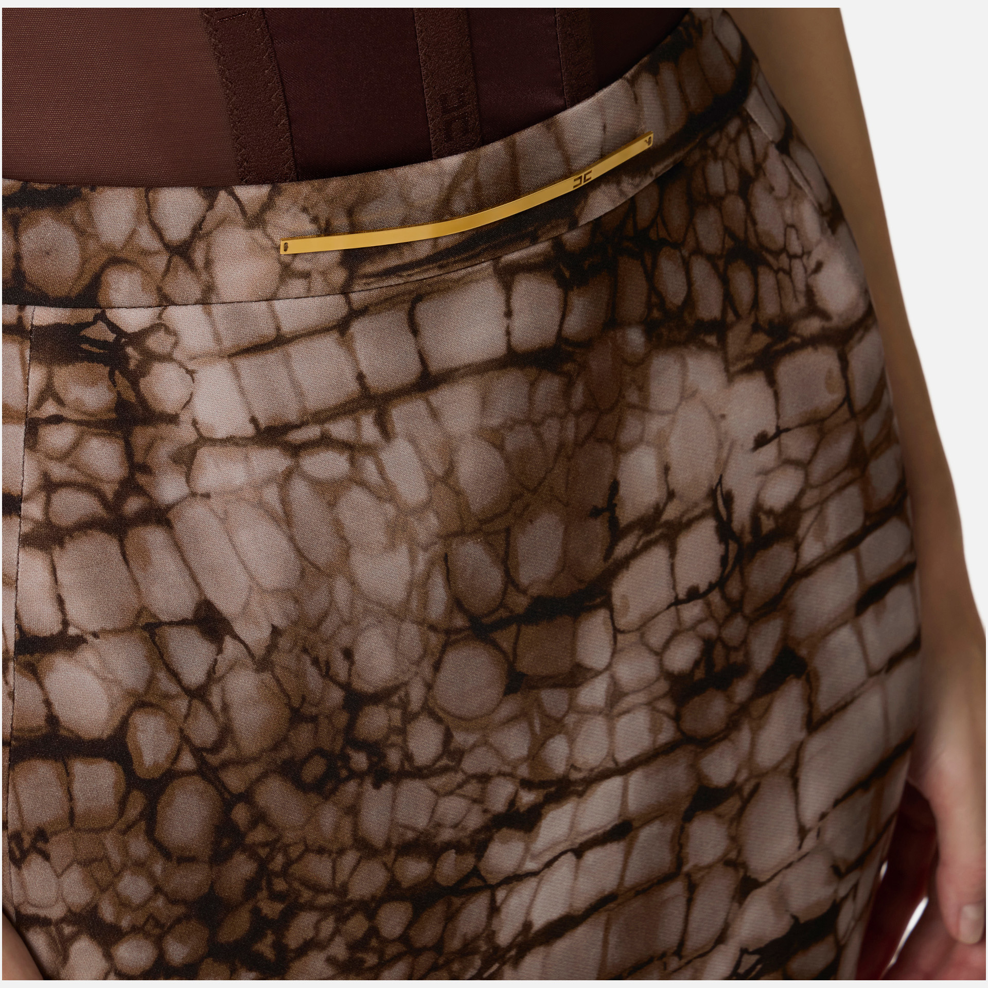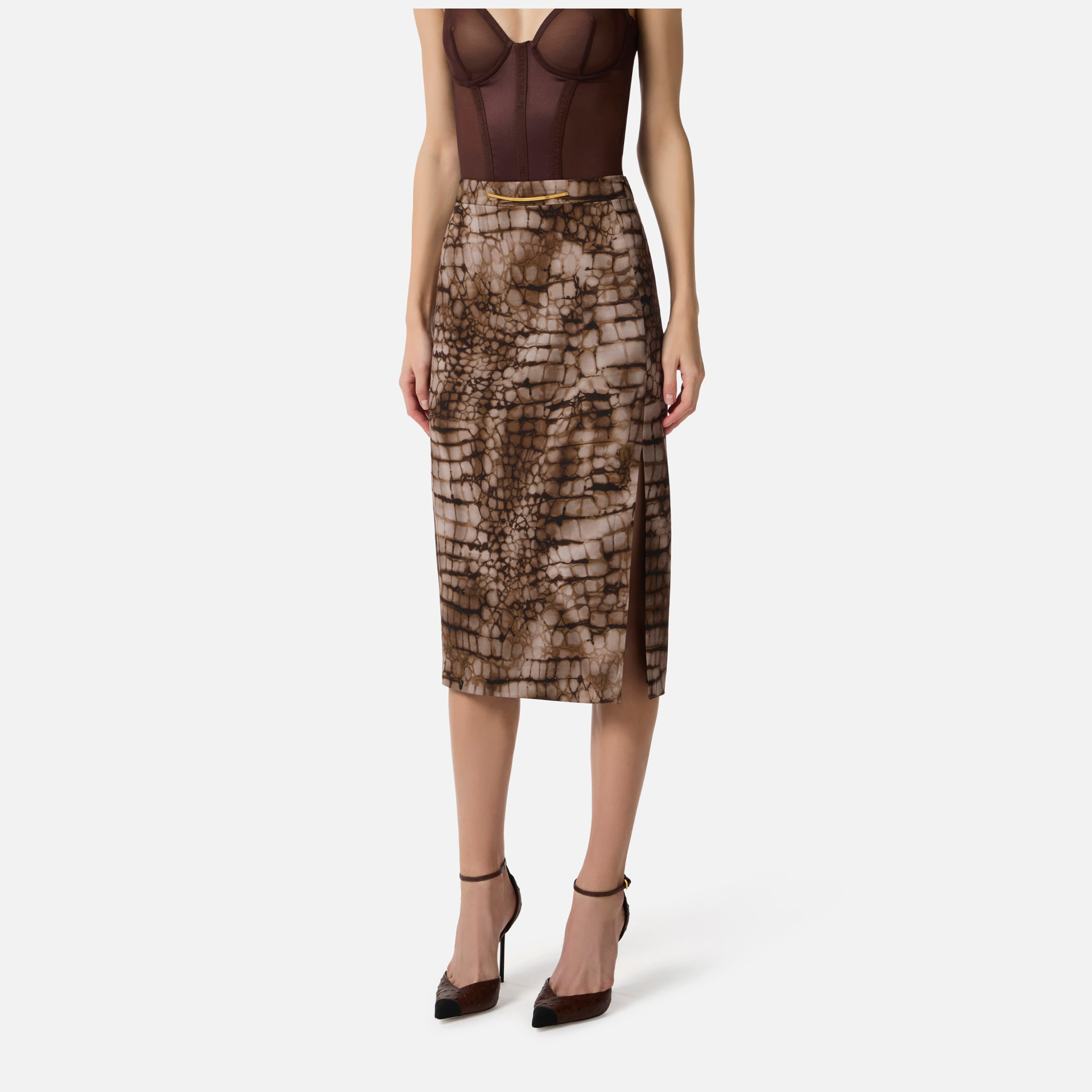 Fustă Elisabetta Franchi – fustă midi cu model aligator, cu design sofisticat și detalii elegante. Despicăturile laterale adaugă un plus de feminitate și libertate de mișcare, iar logo-ul metalic auriu în talie evidențiază semnătura distinctivă a brandului.