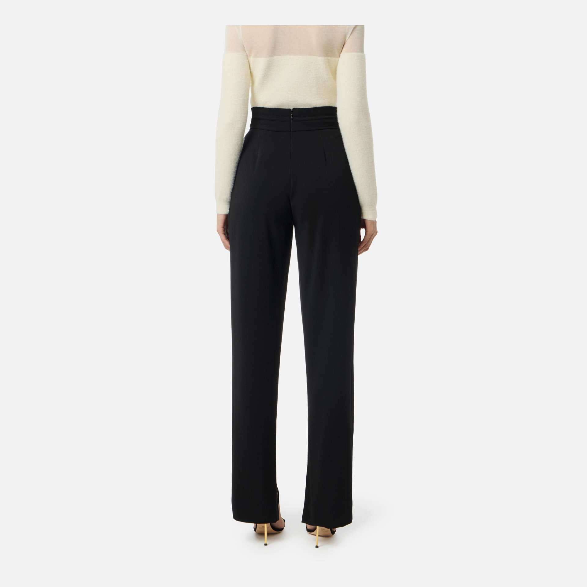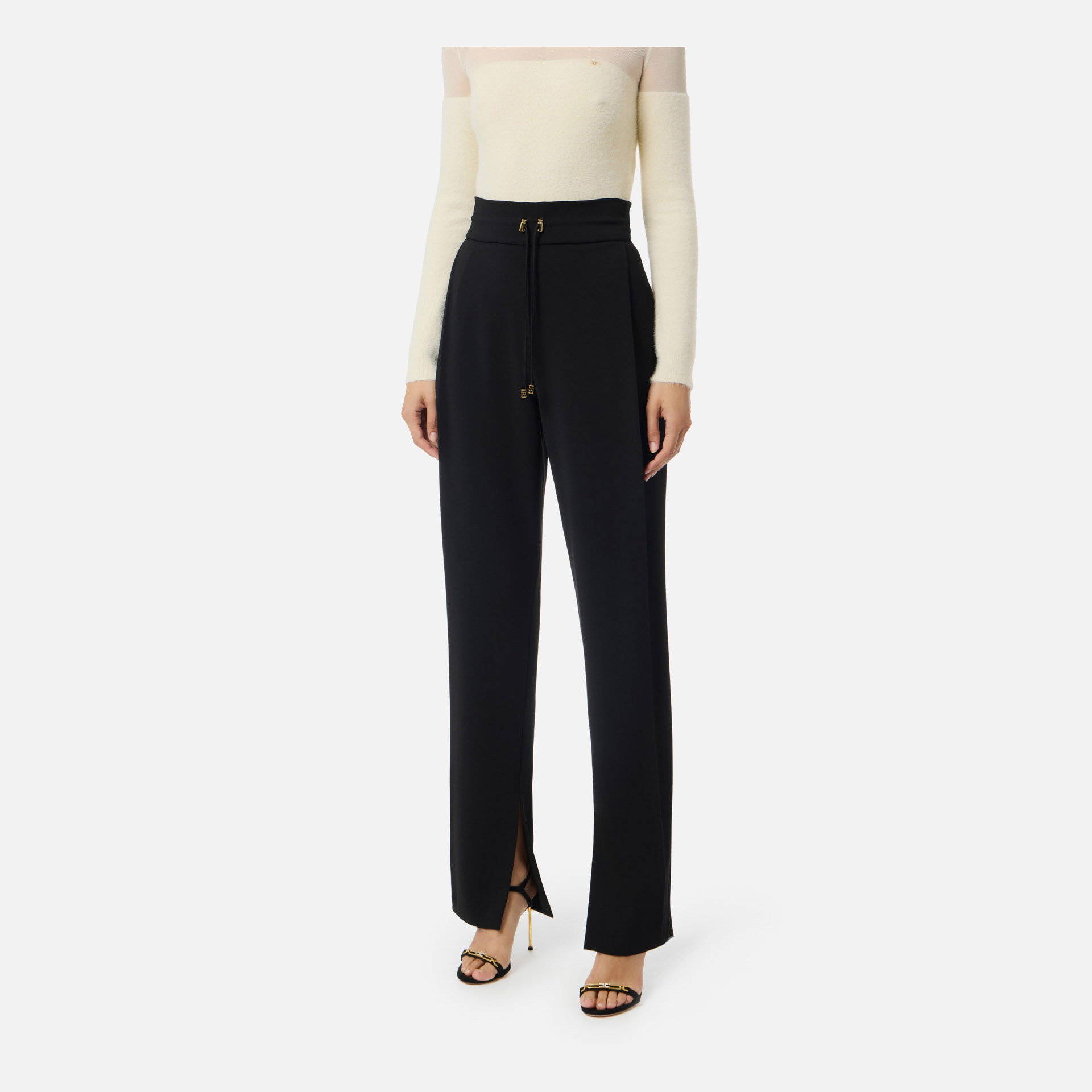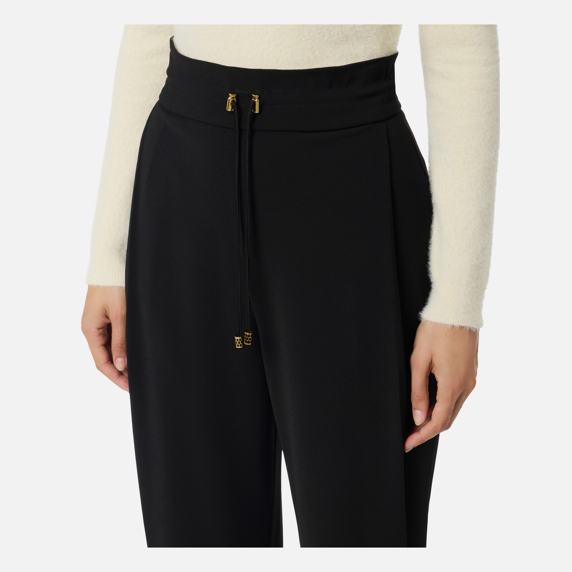 Acești pantaloni Elisabetta Franchi sunt definiția eleganței relaxate, creați dintr-o țesătură ușoară de crep ce asigură lejeritate și fluiditate la purtare. Cu o croială supradimensionată, aceștia oferă un aspect modern și sofisticat, punând în valoare silueta într-un mod subtil. Detaliul de șnur decorativ în talie adaugă un accent chic, iar logo-ul metalic auriu subliniază rafinamentul specific brandului. Închiderea discretă cu fermoar la spate asigură un plus de eleganță și finisaje impecabile.