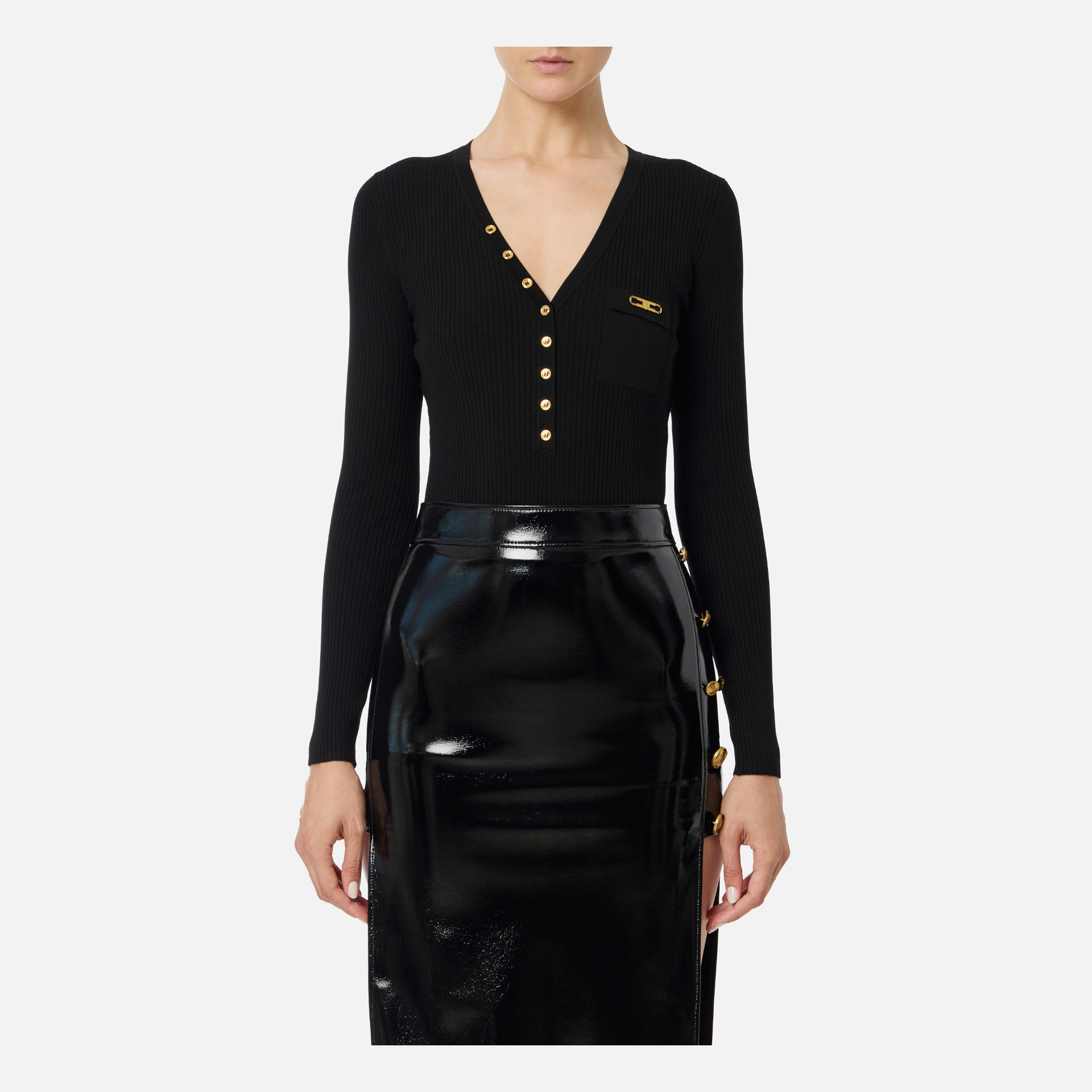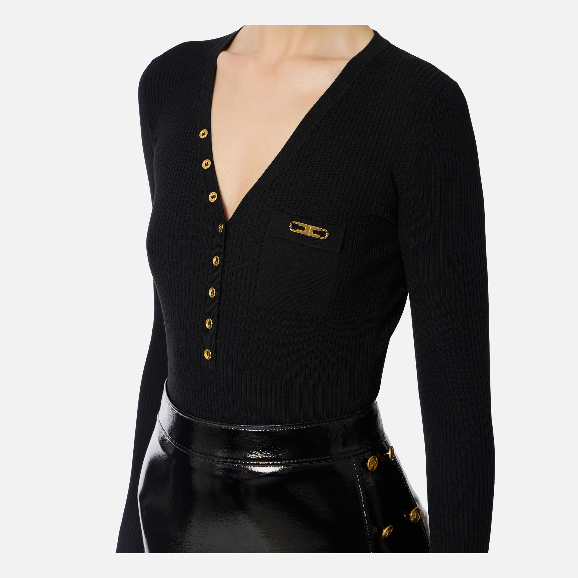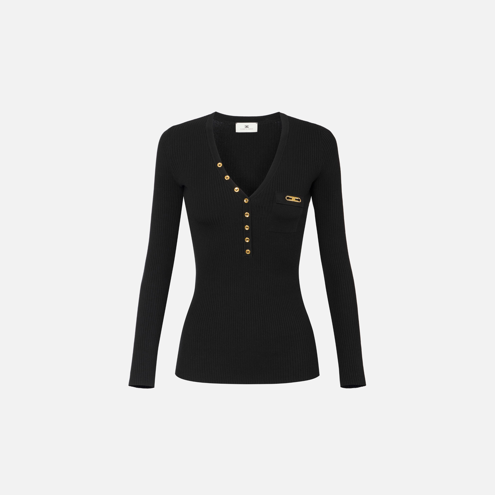 Acest pulover Elisabetta Franchi îmbină perfect confortul cu rafinamentul modern, fiind o alegere ideală pentru ținutele de zi cu zi sau pentru lookuri office elegante. Realizat dintr-o țesătură fină cu model în nervuri, are o croială slim ce avantajează silueta, în timp ce decolteul în V adaugă o notă feminină și sofisticată. Detaliul de lux este dat de buzunarul la piept, accesorizat cu logo metalic auriu, emblematic pentru estetica brandului.