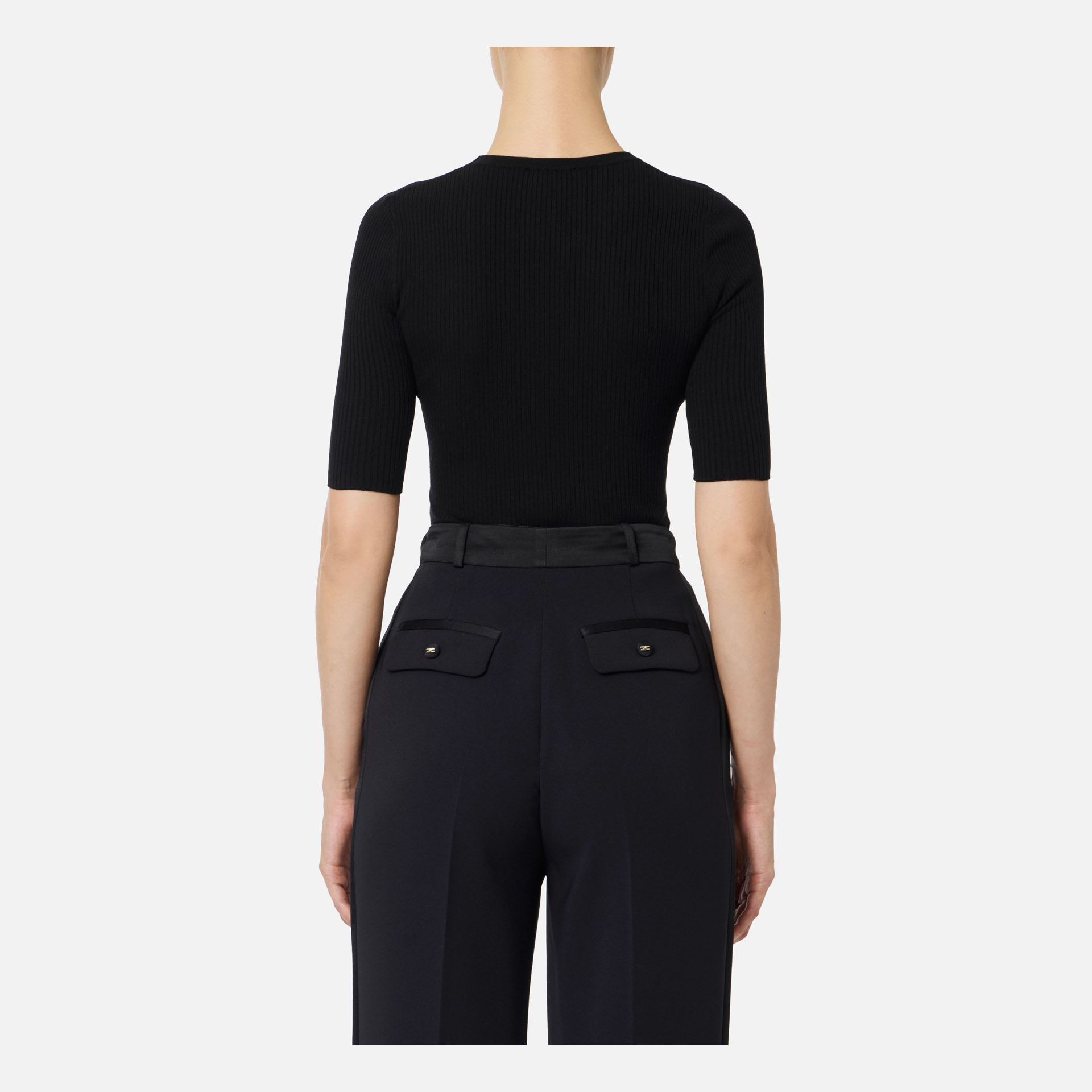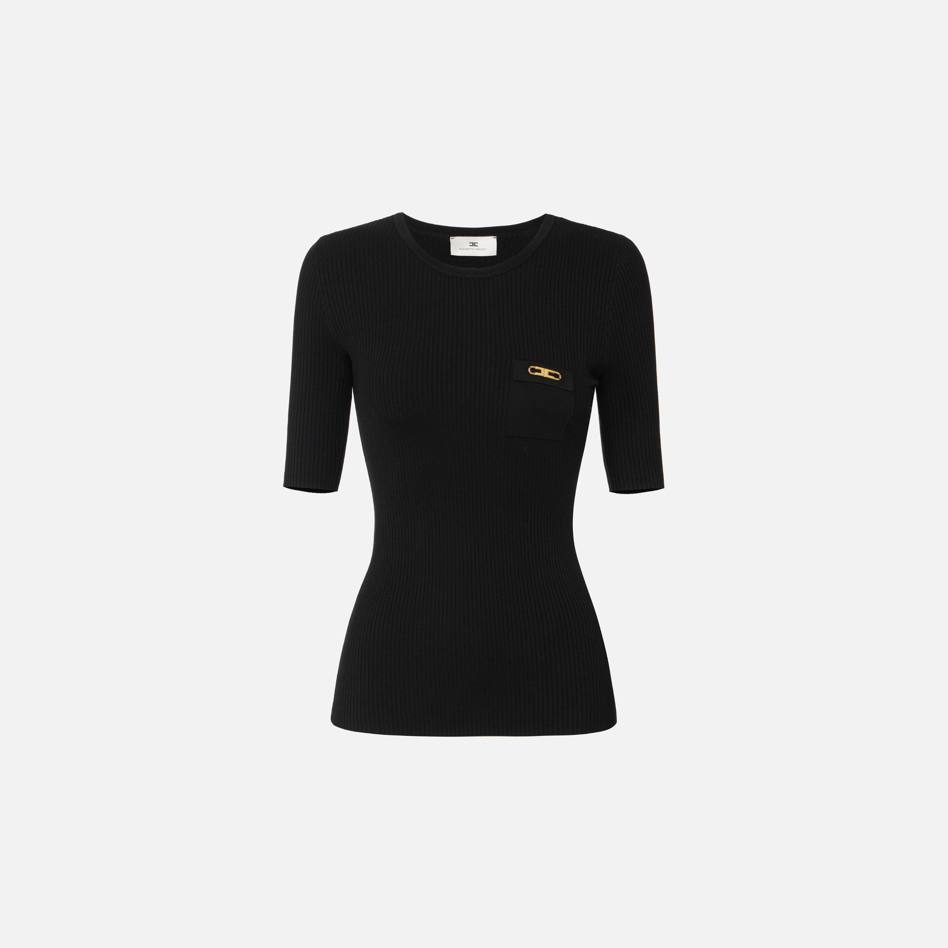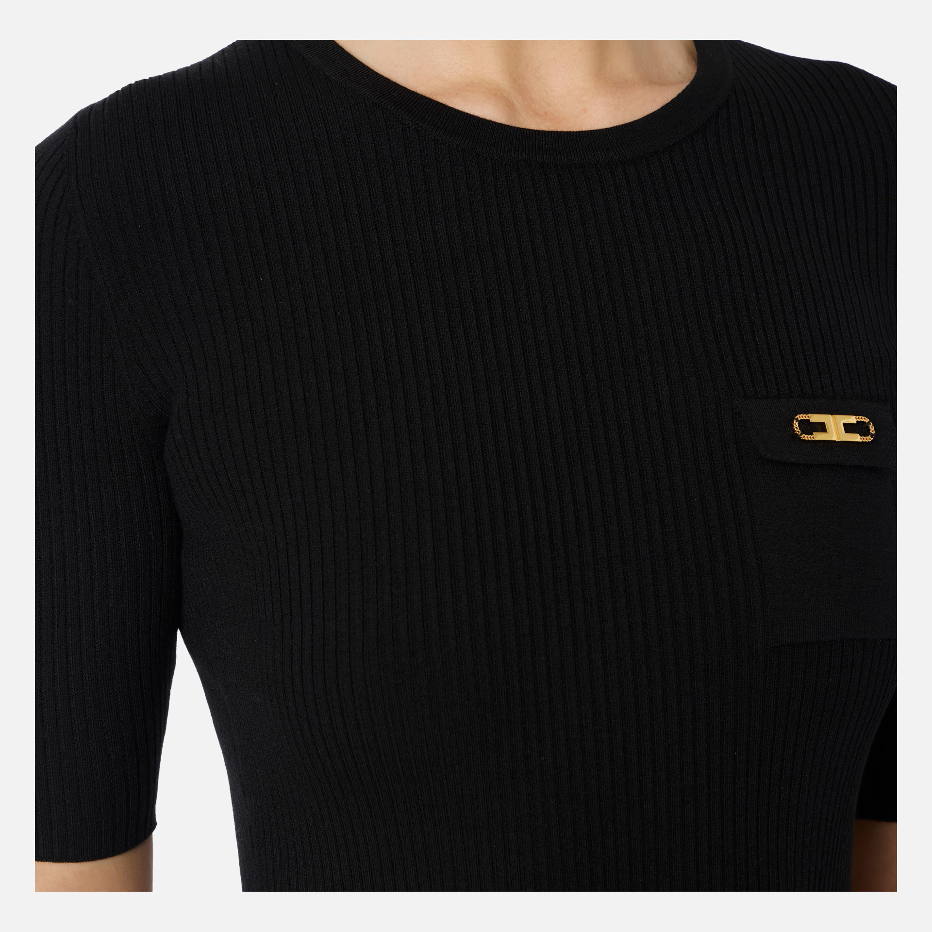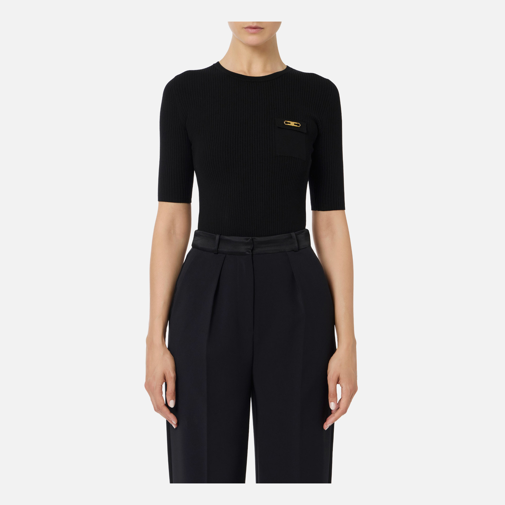 Acest pulover Elisabetta Franchi este o piesă modernă și elegantă, perfectă pentru garderoba de zi cu zi sau pentru ținute office cu un twist rafinat. Realizat dintr-o țesătură fină cu model în nervuri, are o croială slim ce urmează linia siluetei și mâneci scurte, deasupra cotului, care îi conferă un aer contemporan. Detaliul distinctiv este buzunarul la piept accesorizat cu logo metalic auriu, semnătura iconică a brandului.