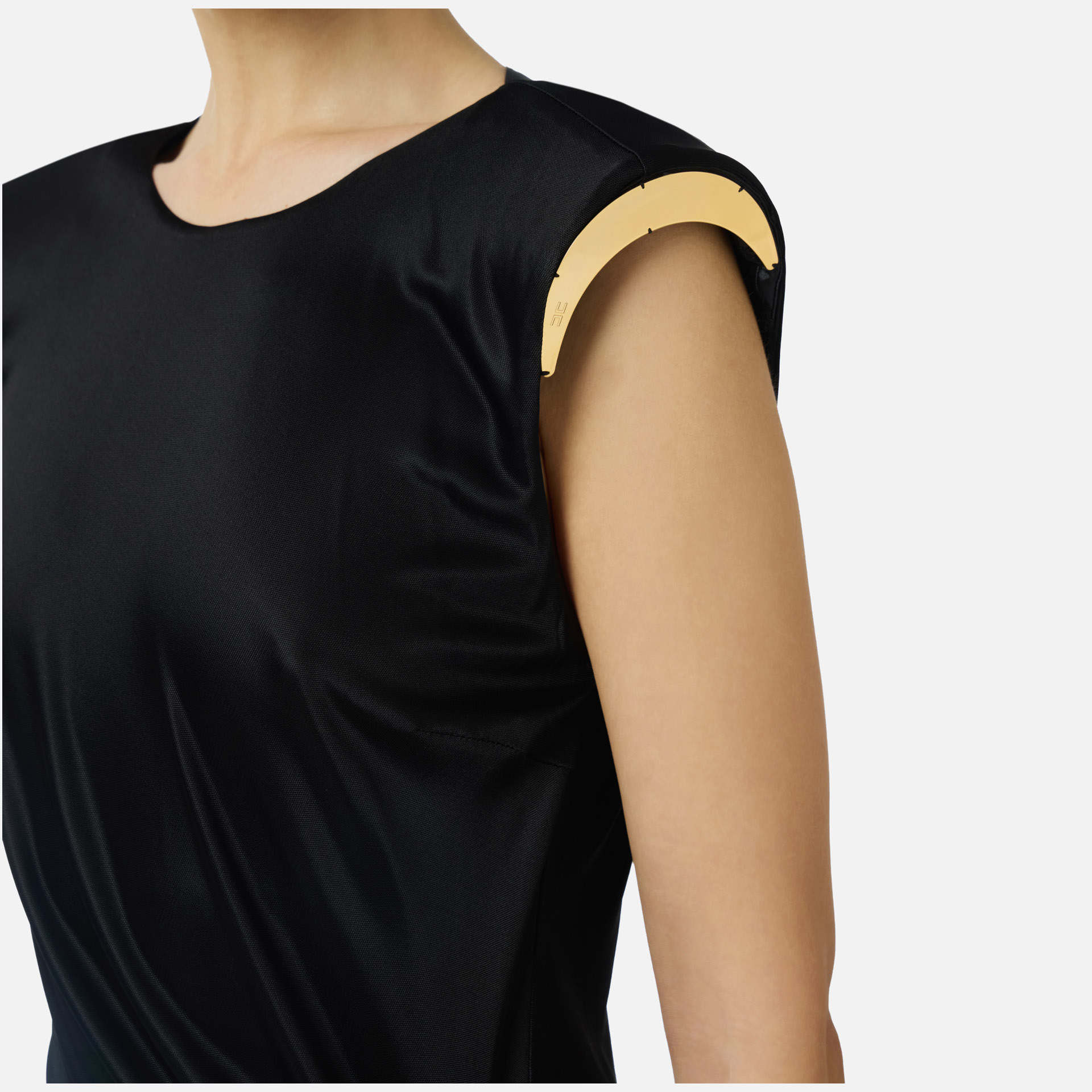 Rochie Elisabetta Franchirochie din vâscoză cu croială slim, ce evidențiază elegant silueta. Designul fără mâneci, cu umeri structurați accentuați de o semilună metalică aurie cu logo, și decolteul în V oferă un look sofisticat și modern.