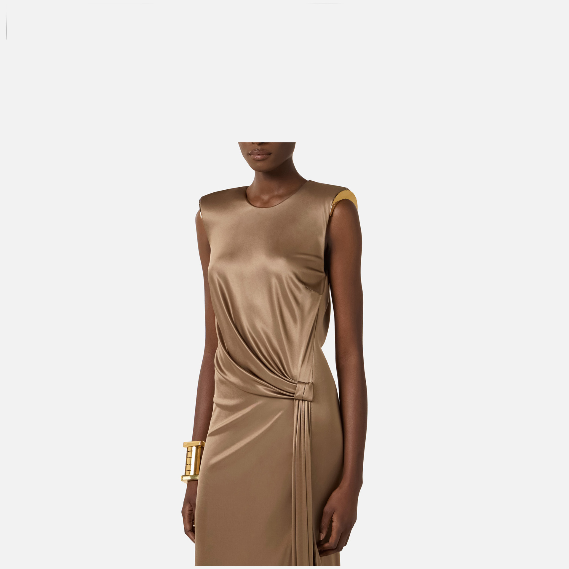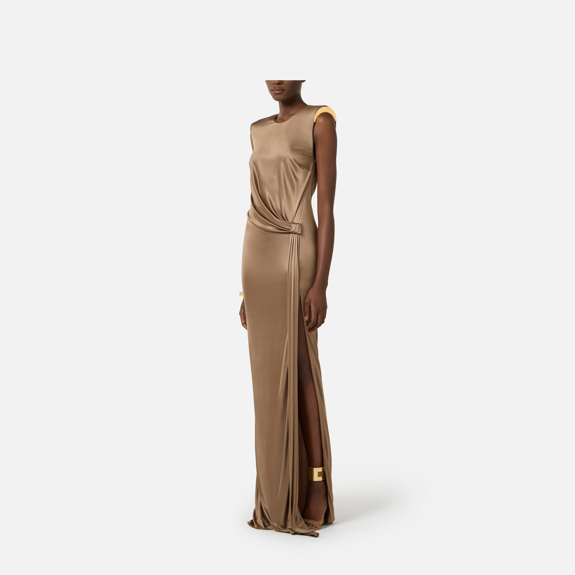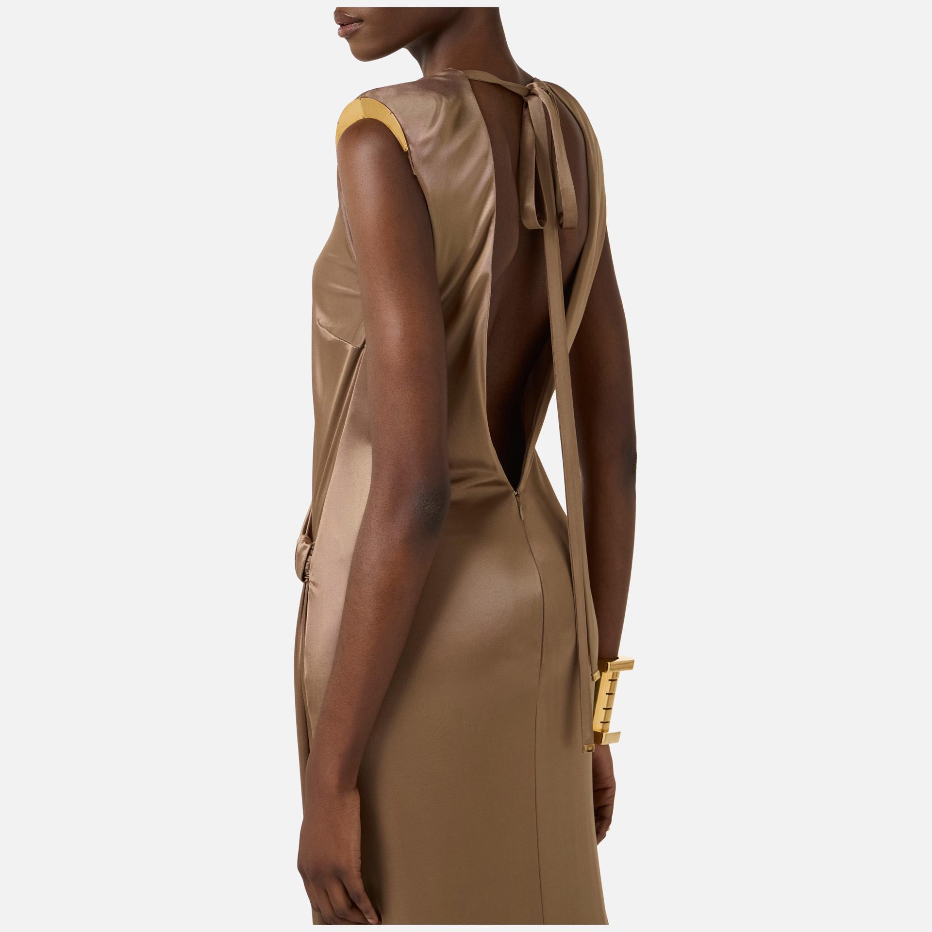 Rochie Elisabetta Franchi – rochie din vâscoză cu croială slim, ce evidențiază elegant silueta. Designul fără mâneci, cu umeri structurați accentuați de o semilună metalică aurie cu logo, și decolteul în V oferă un look sofisticat și modern.