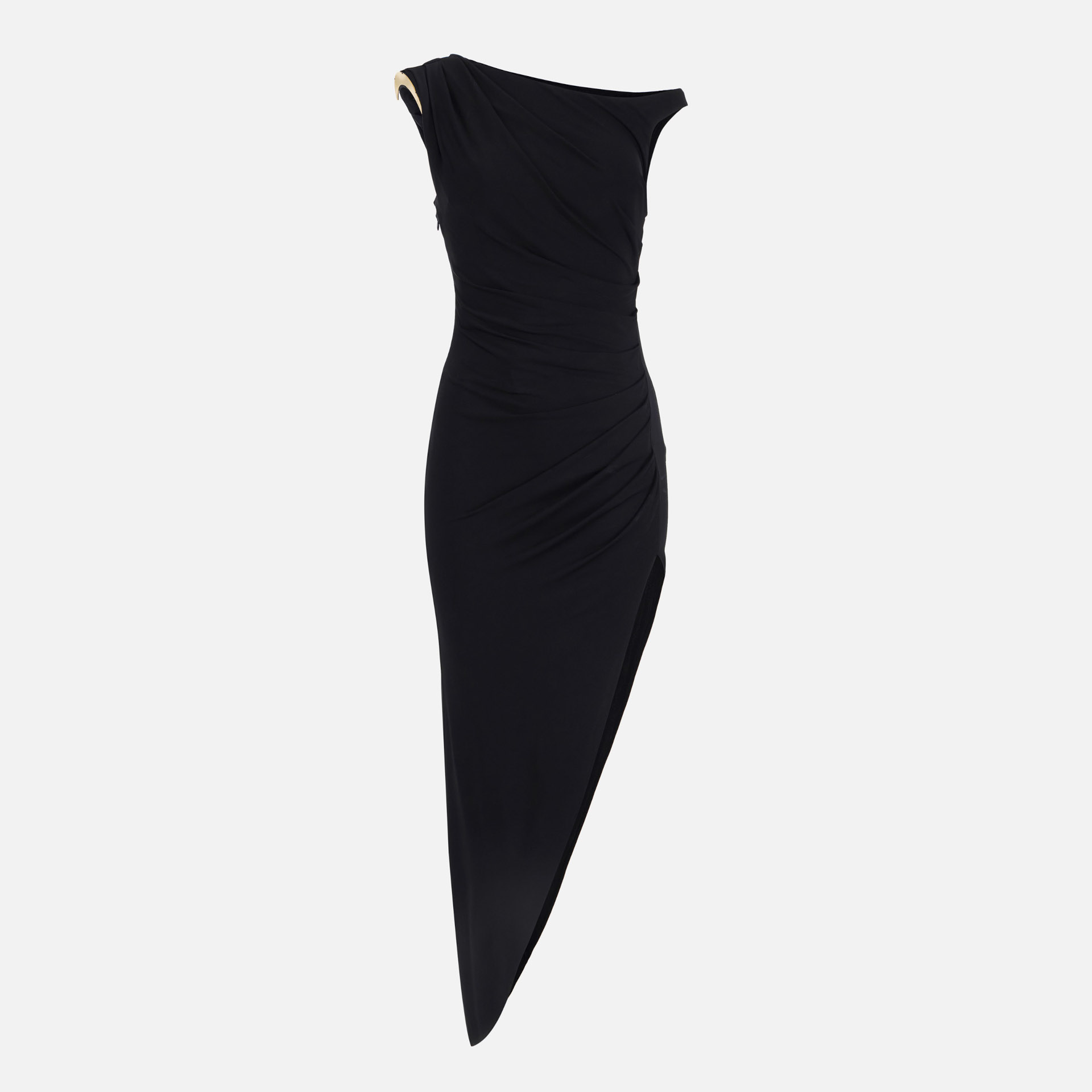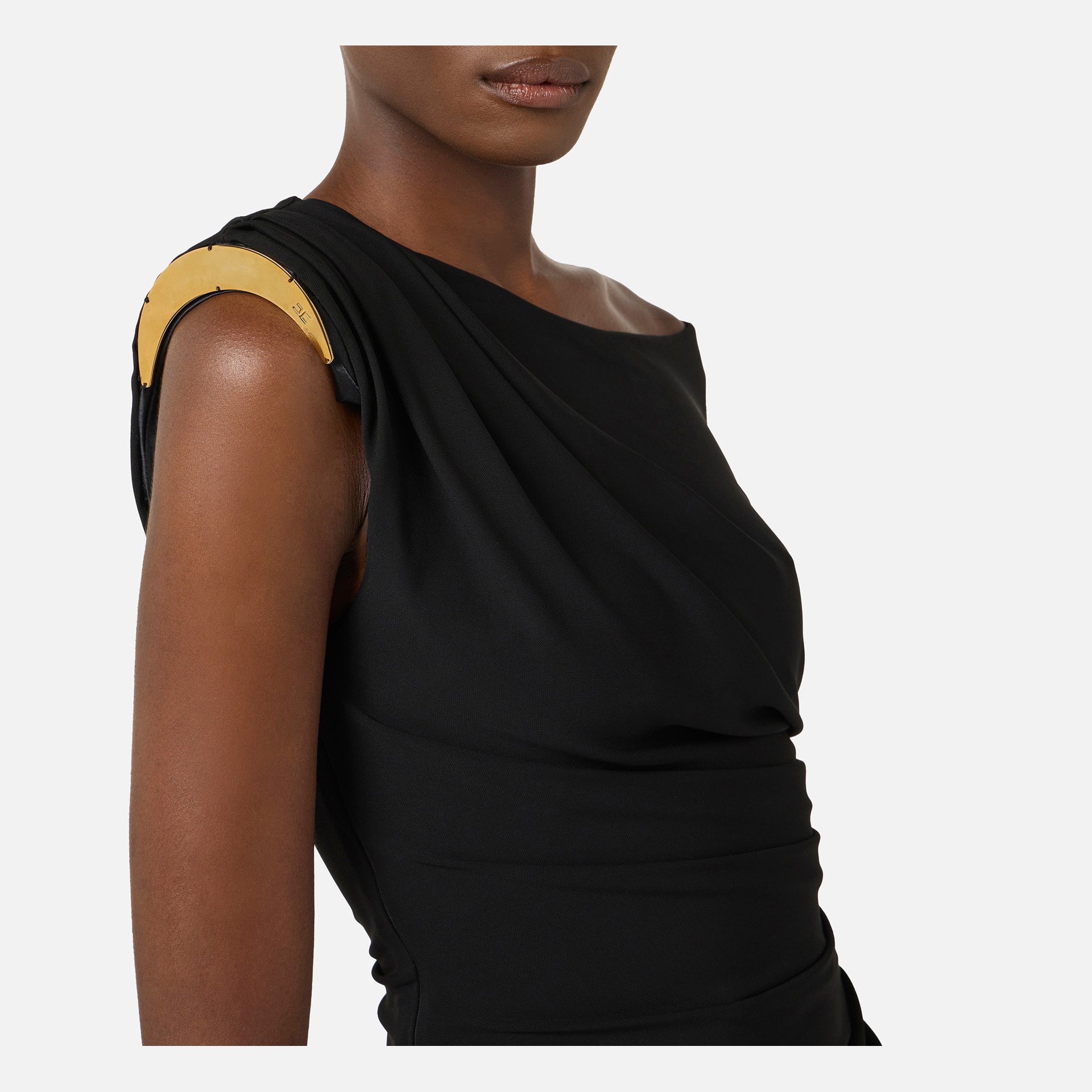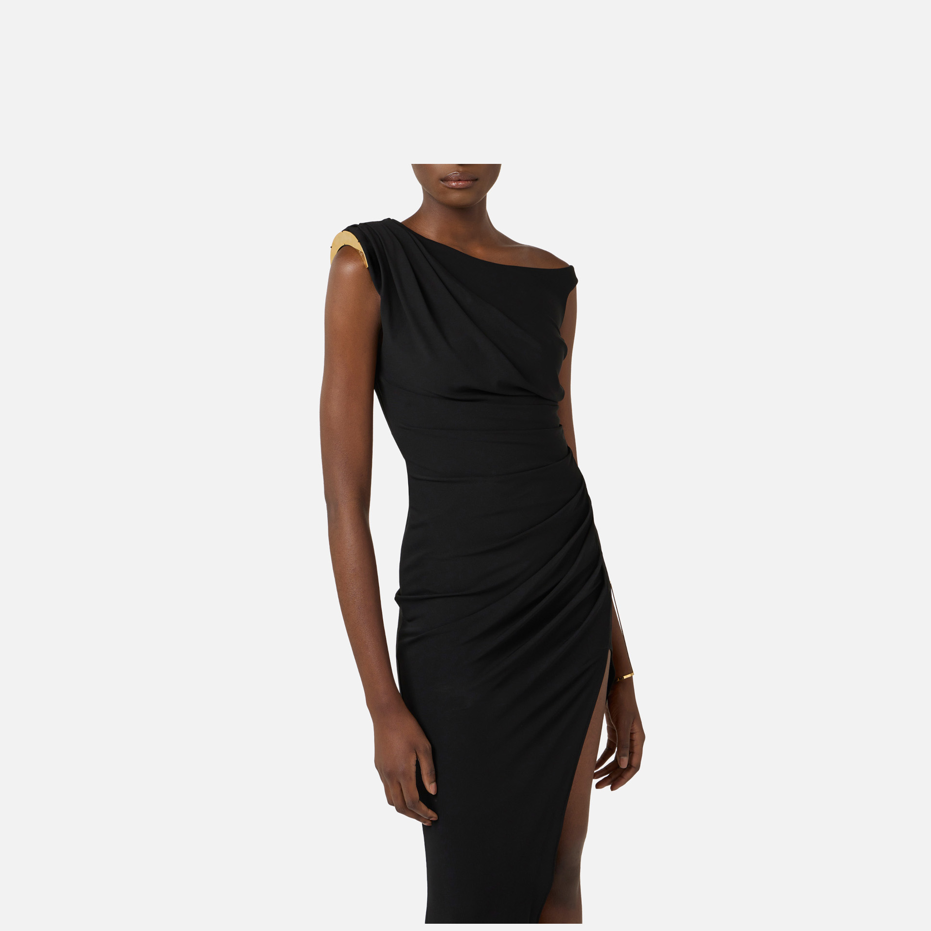 Rochie Elisabetta Franchi – rochie din crepe cu croială slim, ce evidențiază silueta printr-un design sofisticat și modern. Modelul cu un singur umăr, fixat cu o semilună metalică aurie cu logo, și fusta cu croială asimetrică transformă această piesă într-o alegere statement pentru apariții elegante.