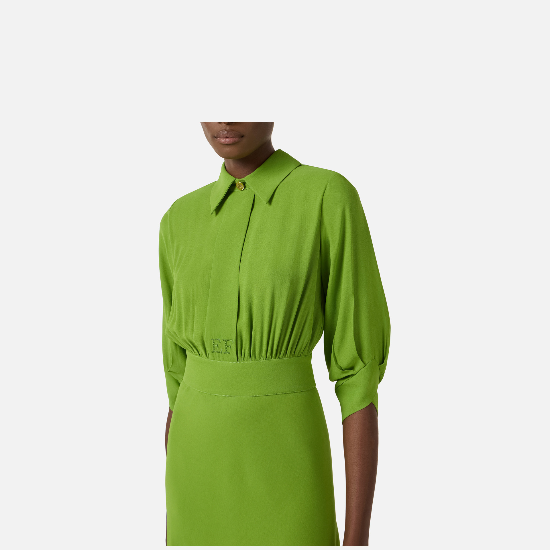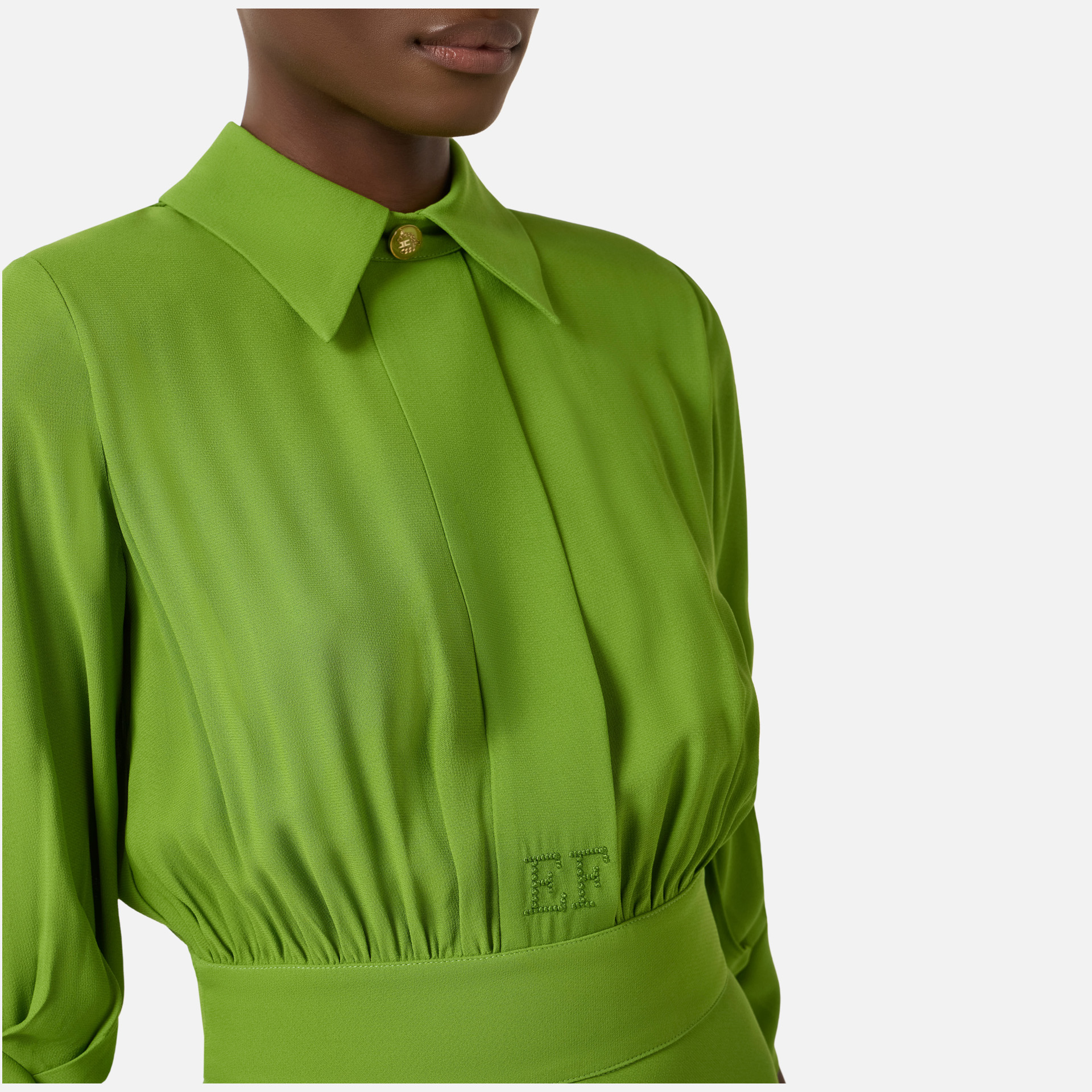 Rochie Elisabetta Franchi – rochie midi din vâscoză cu design feminin și rafinat, ideală pentru apariții elegante de zi sau de seară. Mânecile trei sferturi și fusta cu volane oferă un aer romantic, completat de detalii sofisticate.