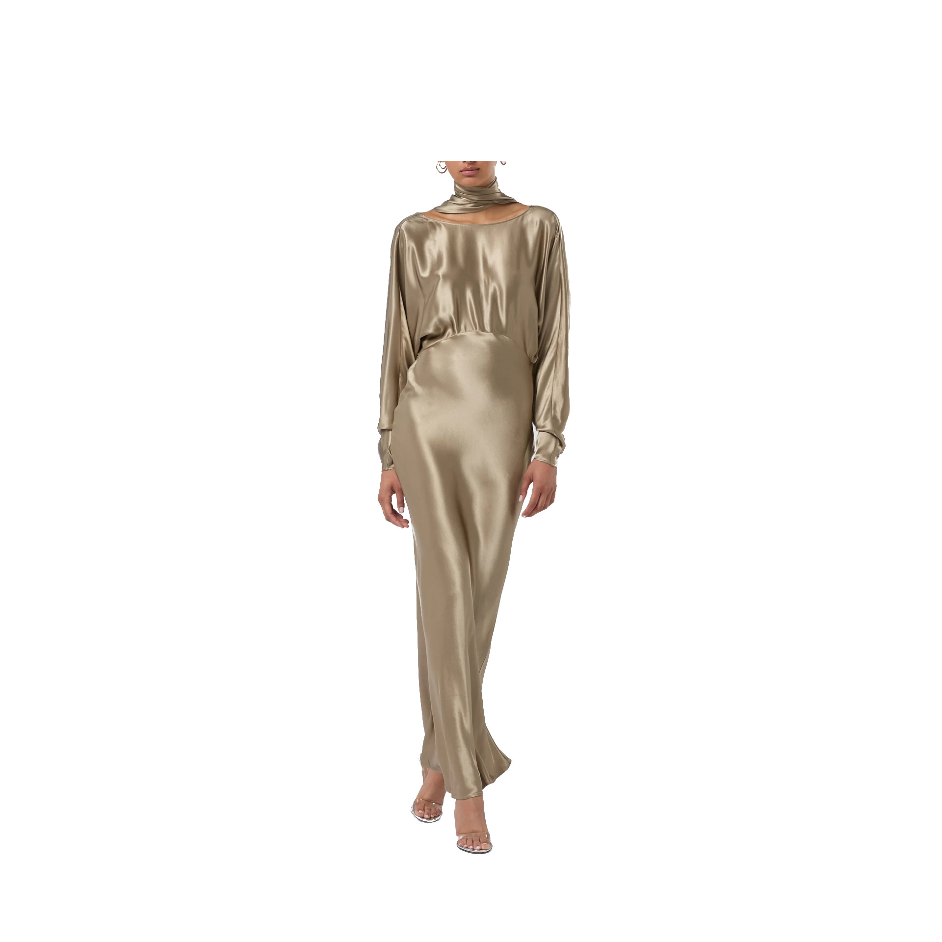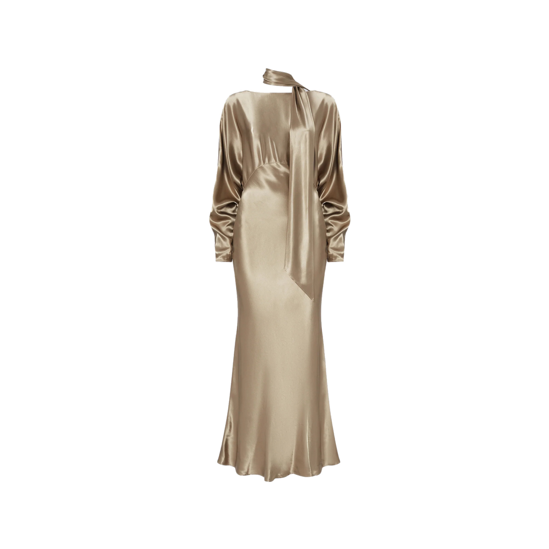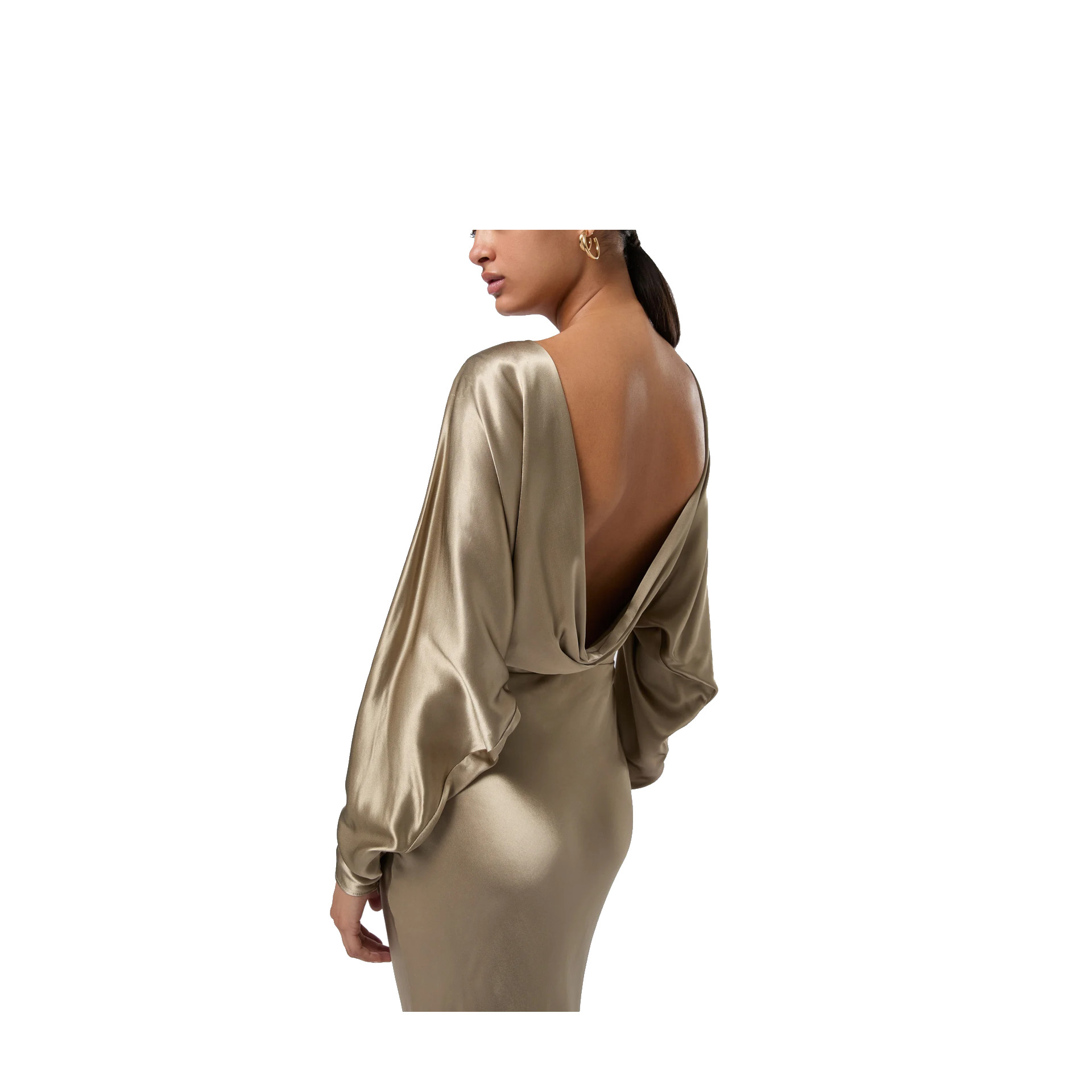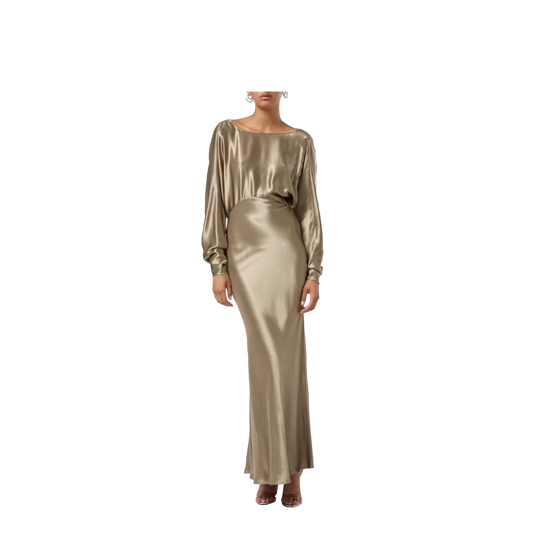 Această rochie The Andamane impresionează prin croiala fluidă și țesătura strălucitoare ce captează subtil lumina. Decolteul tip barcă și mânecile lungi adaugă rafinament, în timp ce spatele decoltat conferă o notă seducătoare. Fusta lungă completează silueta elegantă, transformând această piesă într-o alegere ideală pentru evenimente speciale sau seri deosebite.