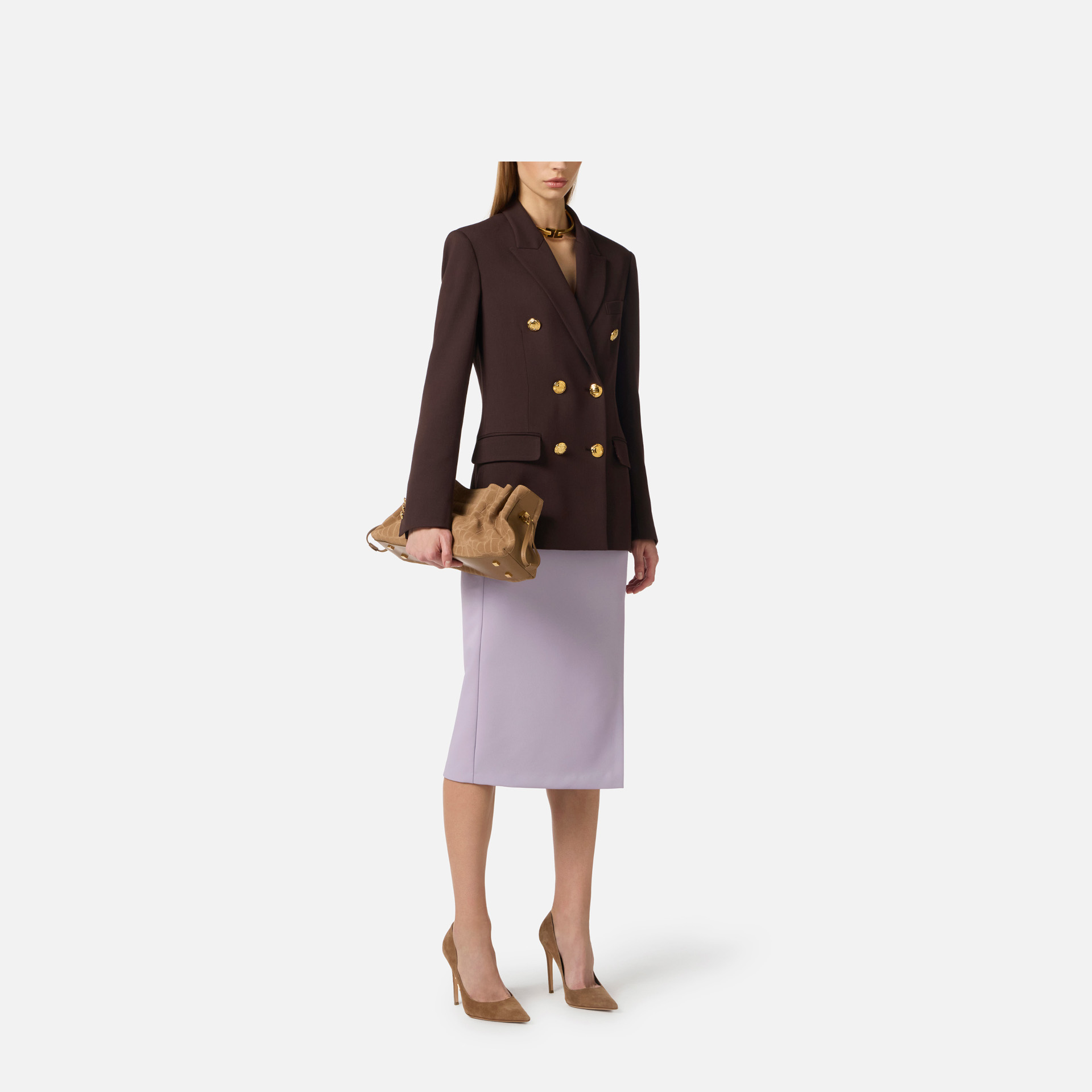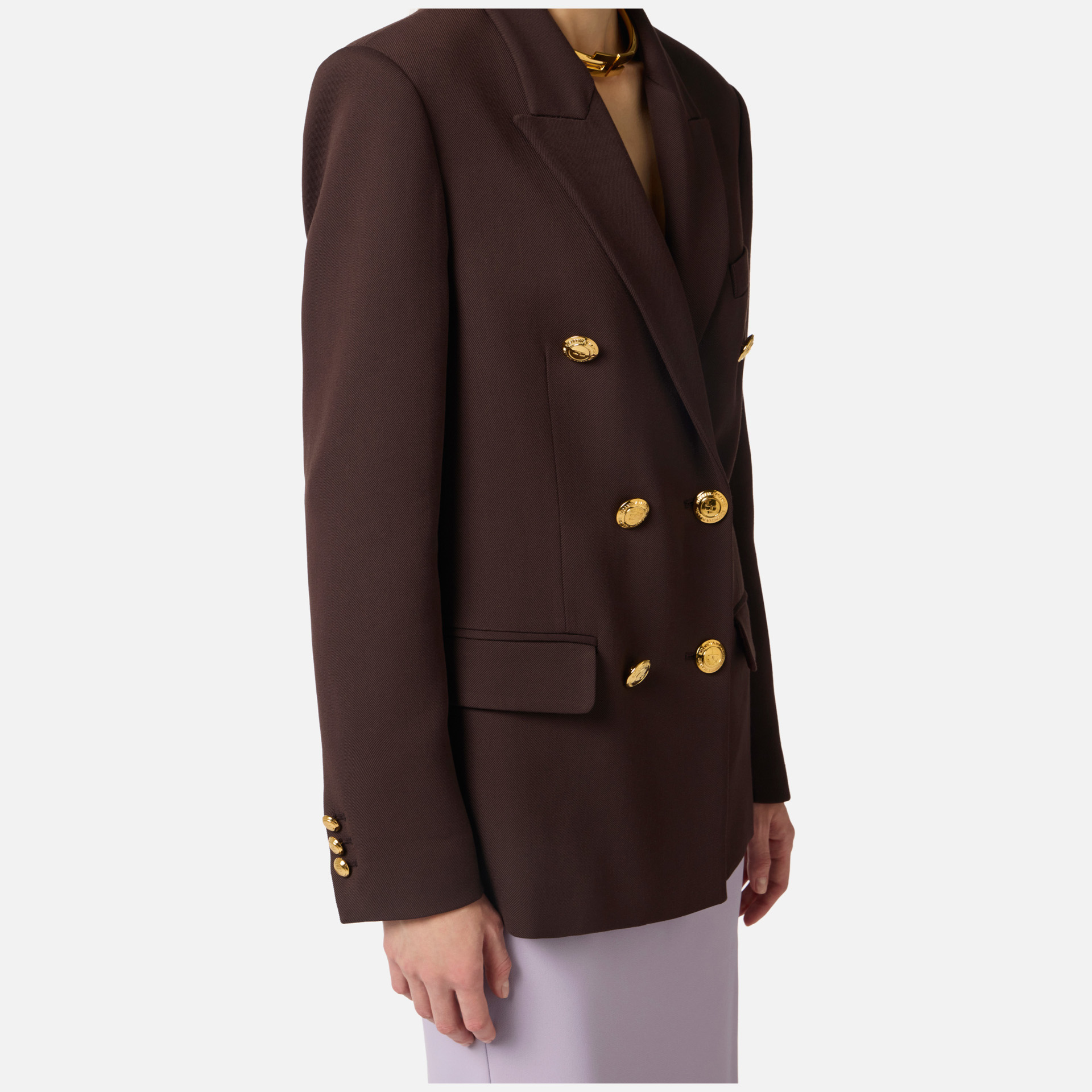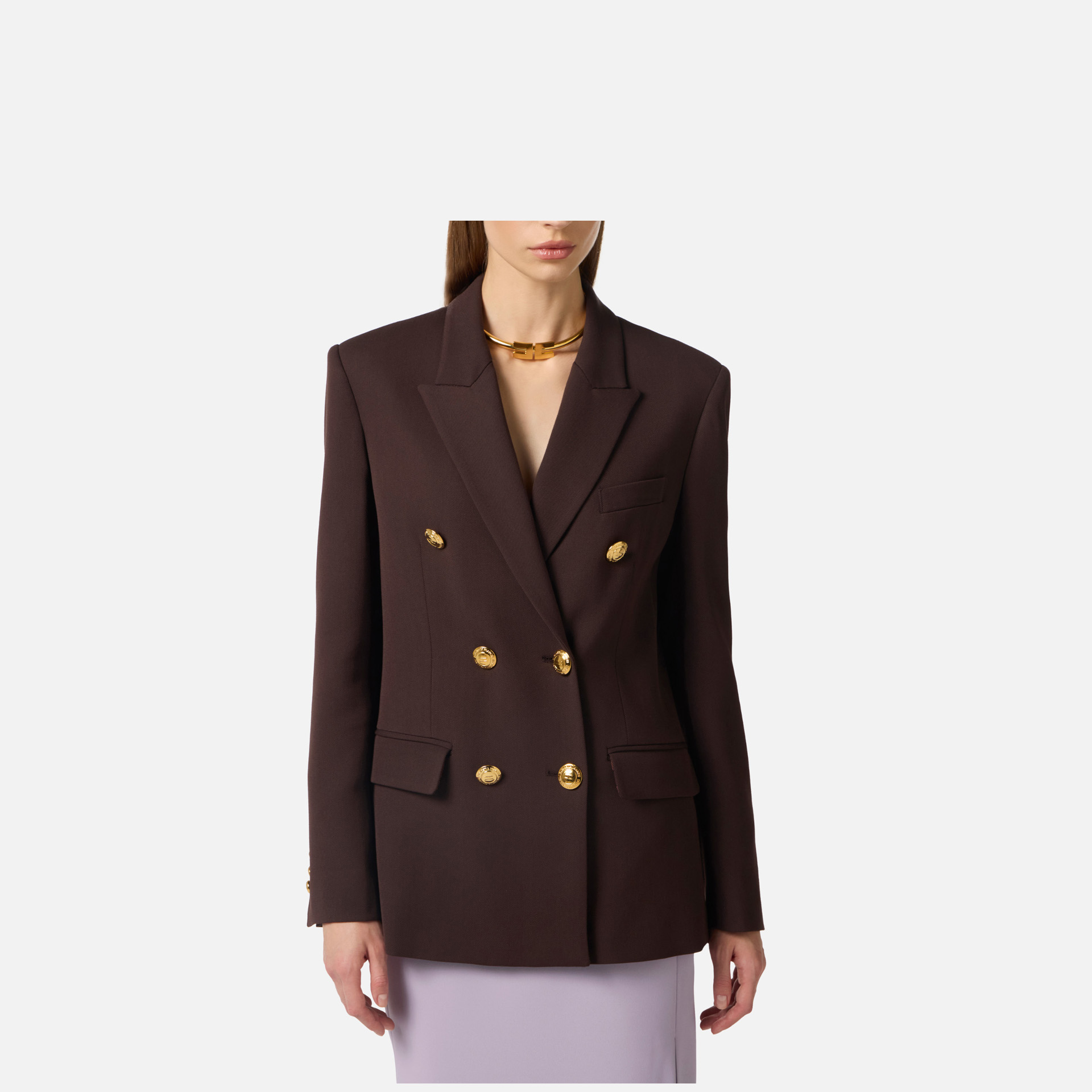 Sacou Elisabetta Franchi – sacou cu două rânduri de nasturi cu design elegant și structurat, ideal pentru ținute sofisticate. Umerii structurați și nasturii metalici aurii adaugă un plus de rafinament și stil.