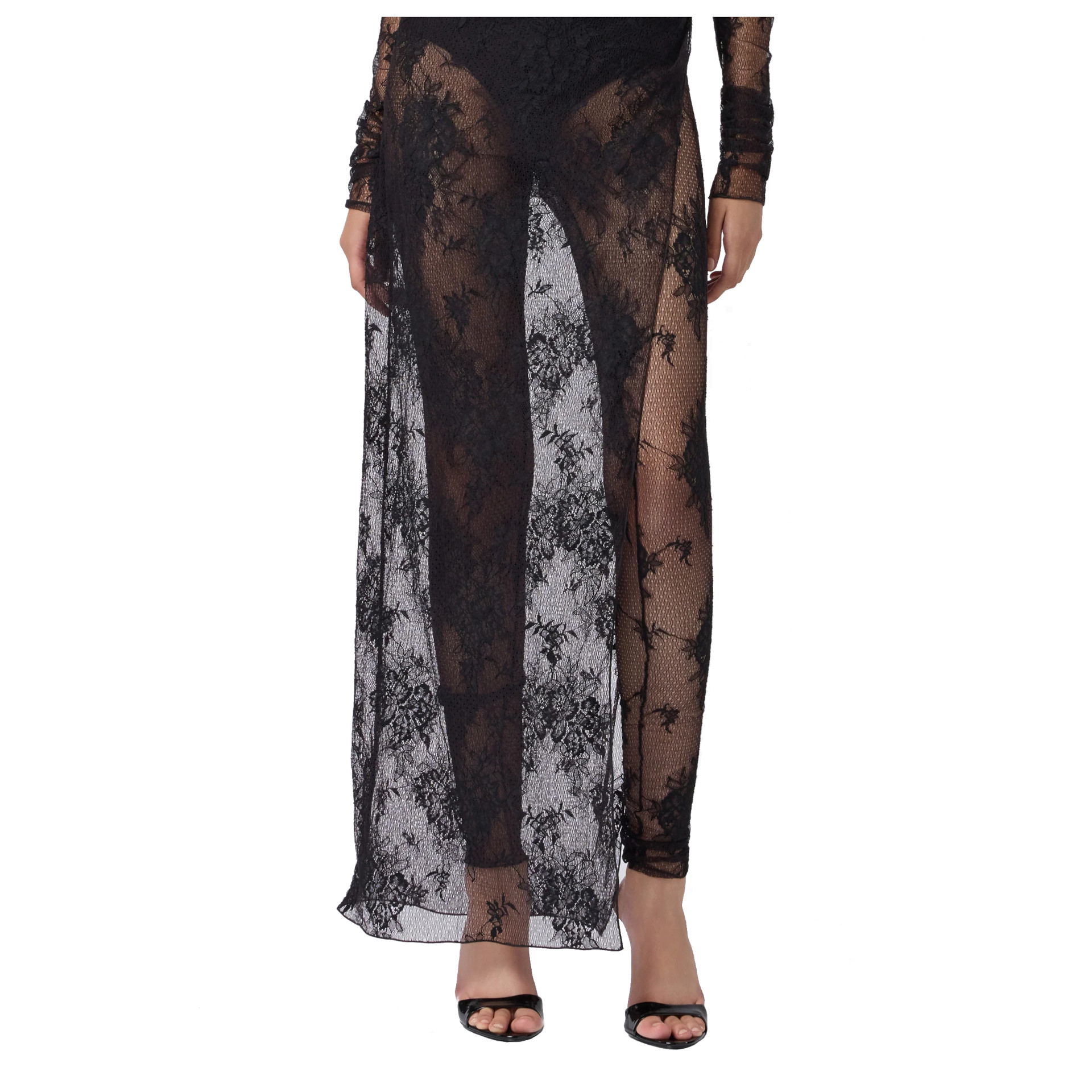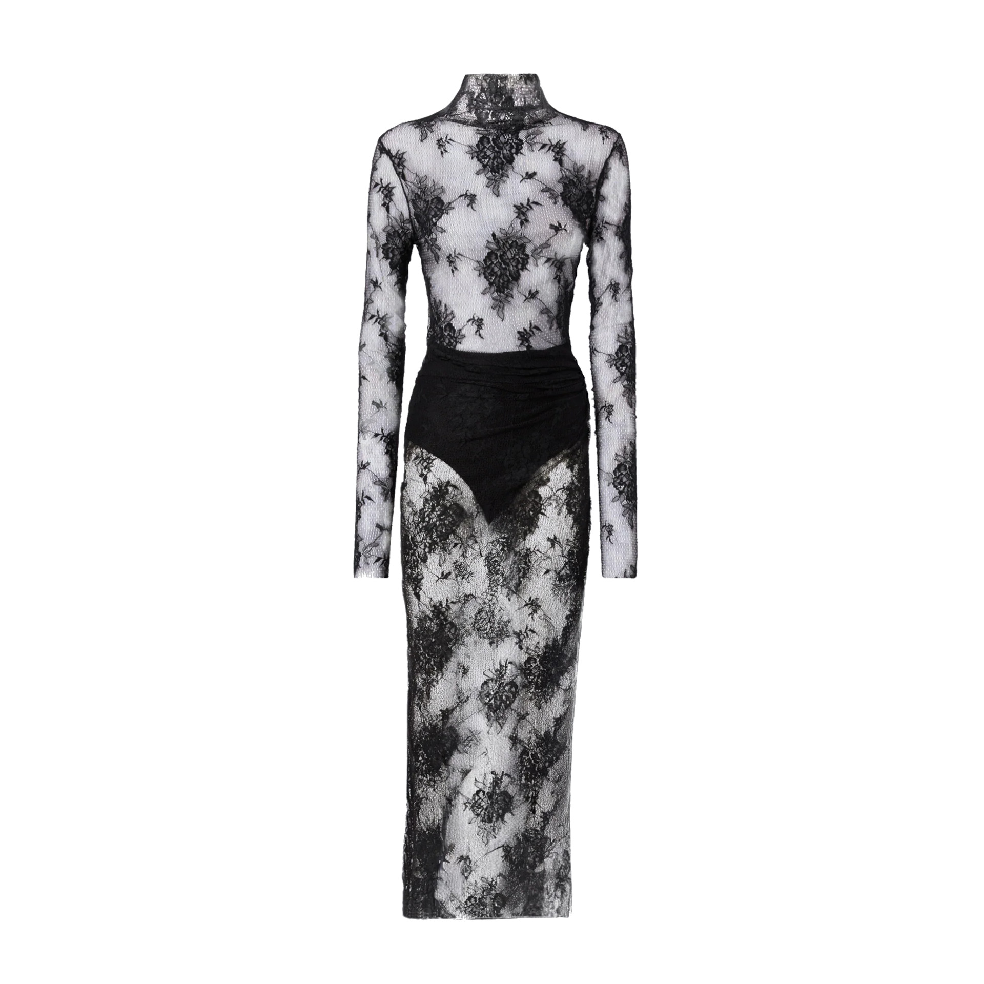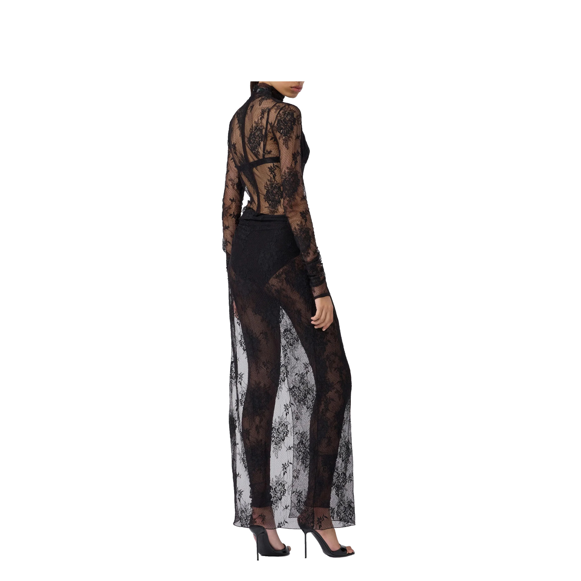 Salopeta The Andamane este o piesă statement, realizată din dantelă fină, cu un design transparent ce evidențiază subtil silueta. Gulerul înalt și mânecile lungi completează armonios colanții lungi integrați, ascunși sub o fustă maxi fluidă, pentru un efect sofisticat și modern.