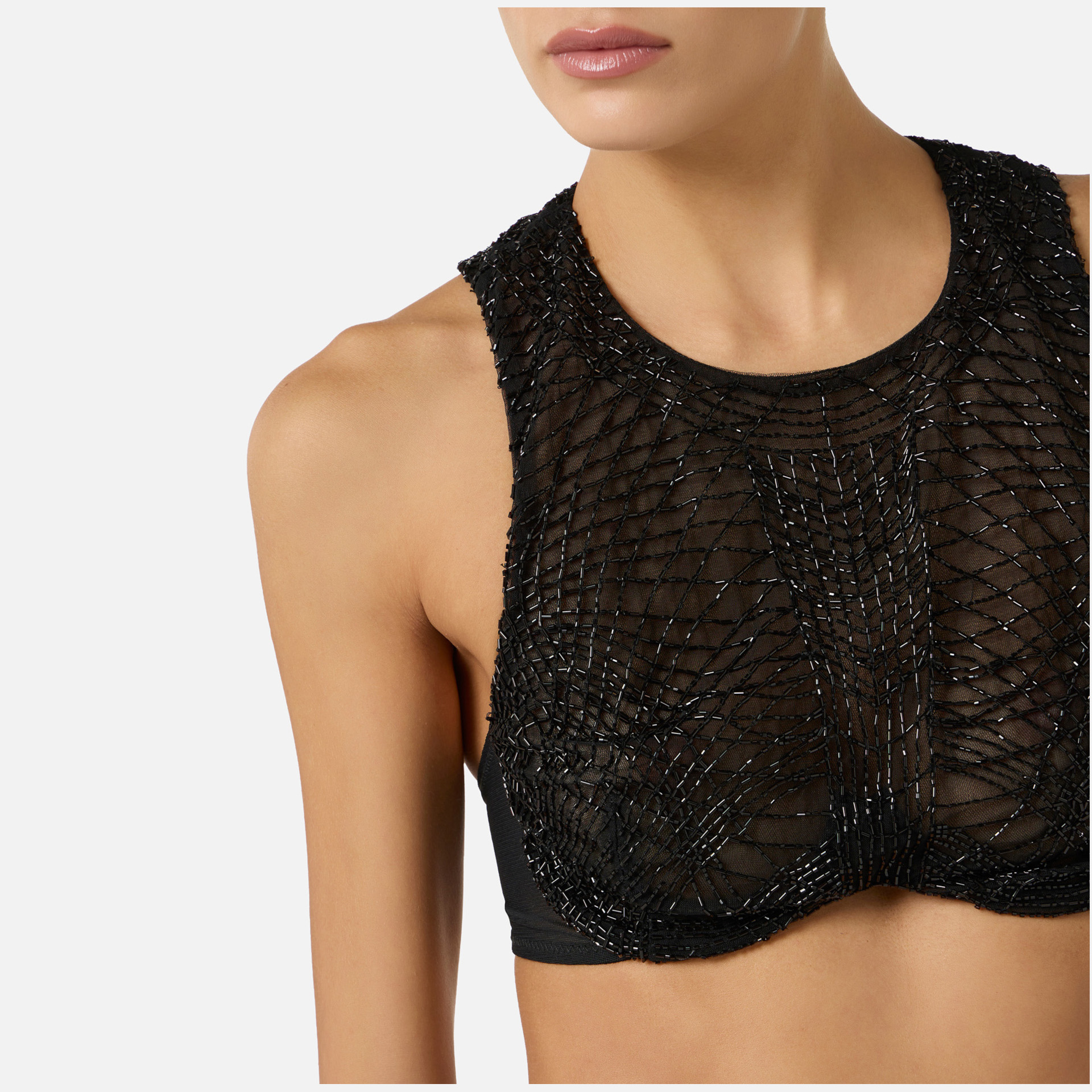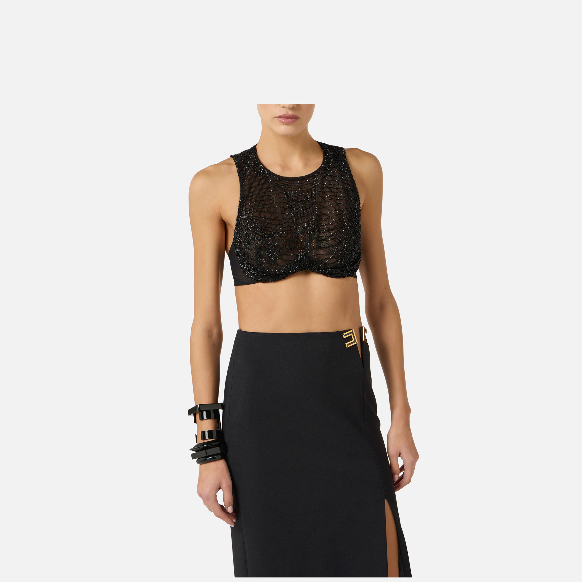 Top Elisabetta Franchitop scurt fără mâneci cu design spectaculos, ideal pentru ținute elegante și apariții statement. Cristalele brodate în model geometric adaugă strălucire și rafinament, evidențiind stilul sofisticat al piesei.
