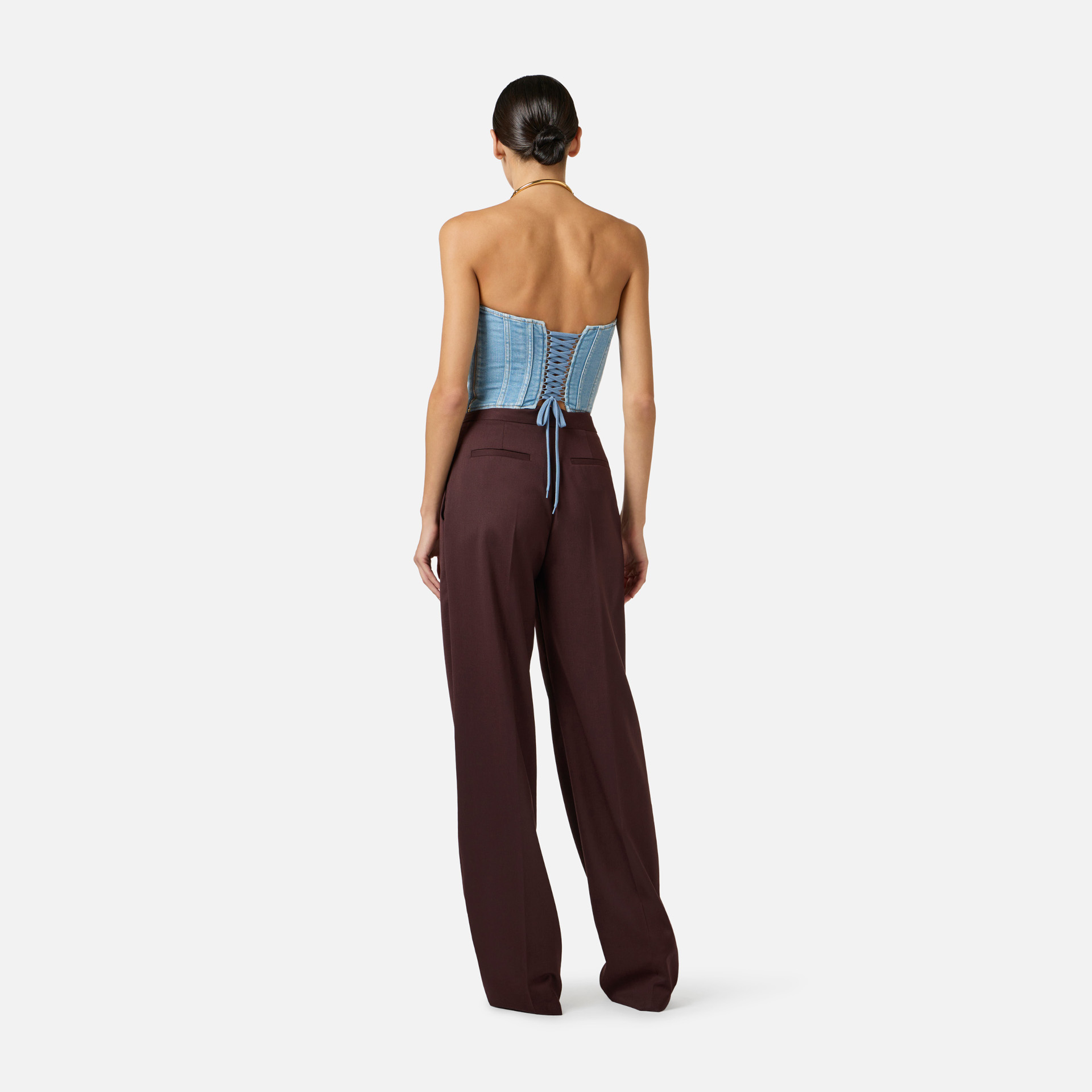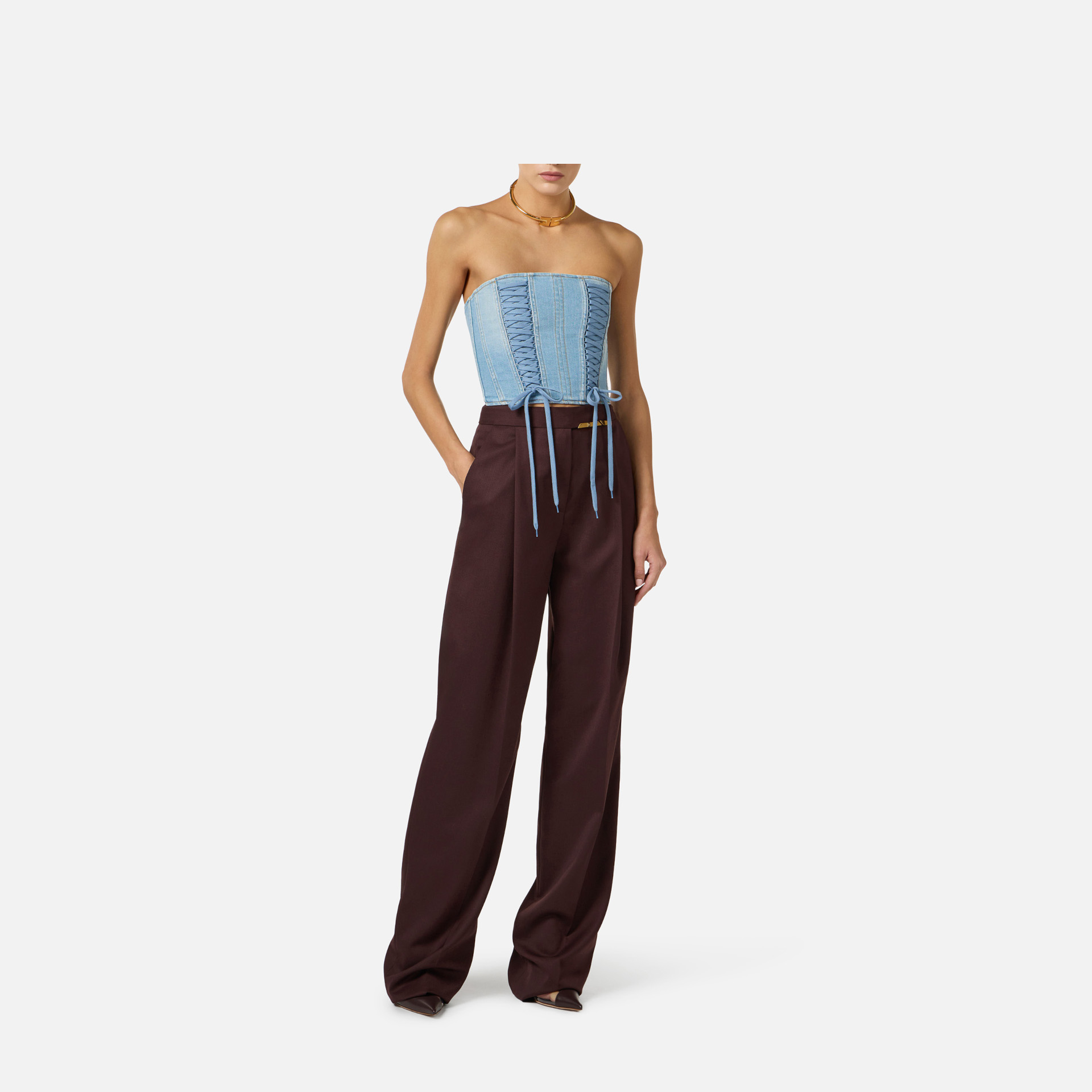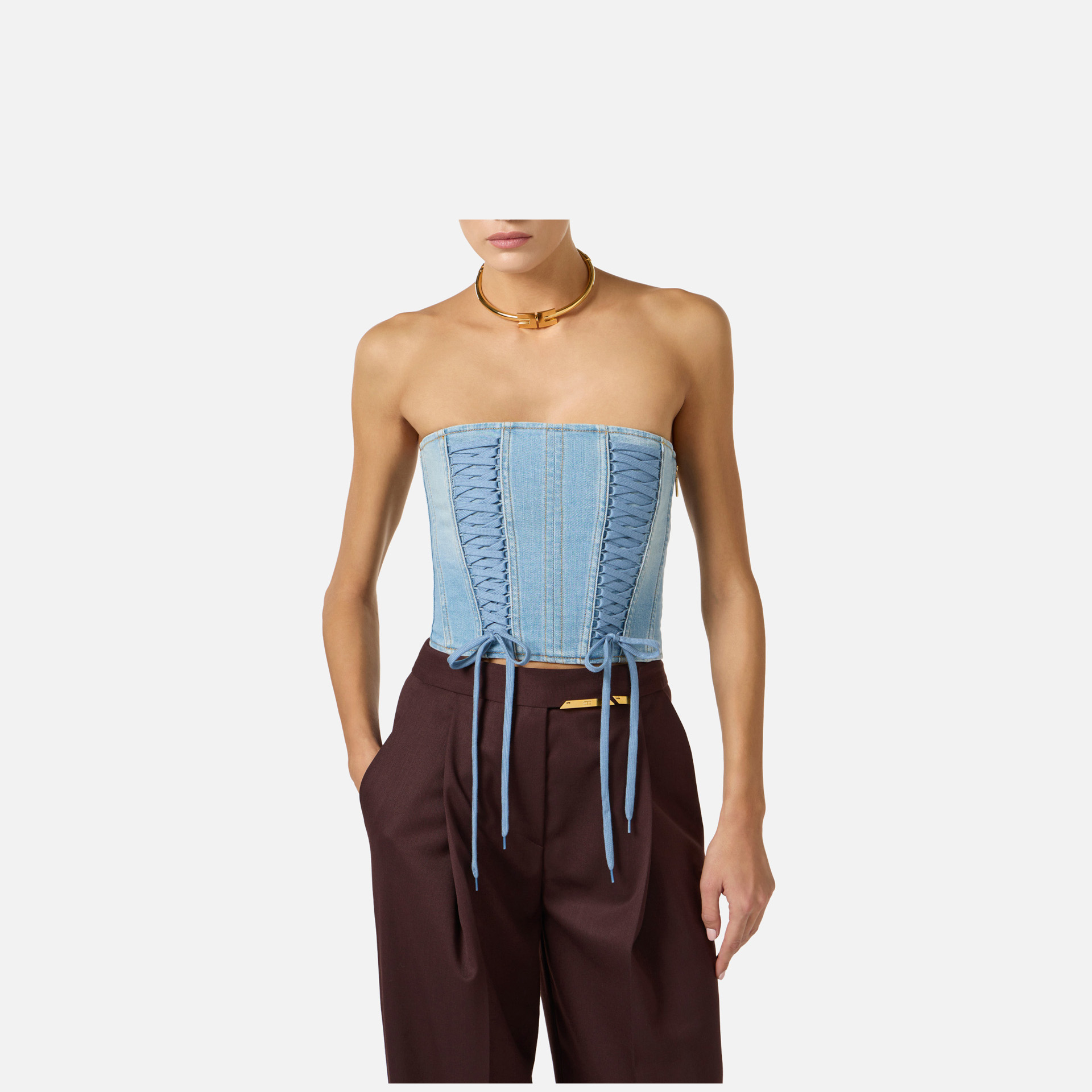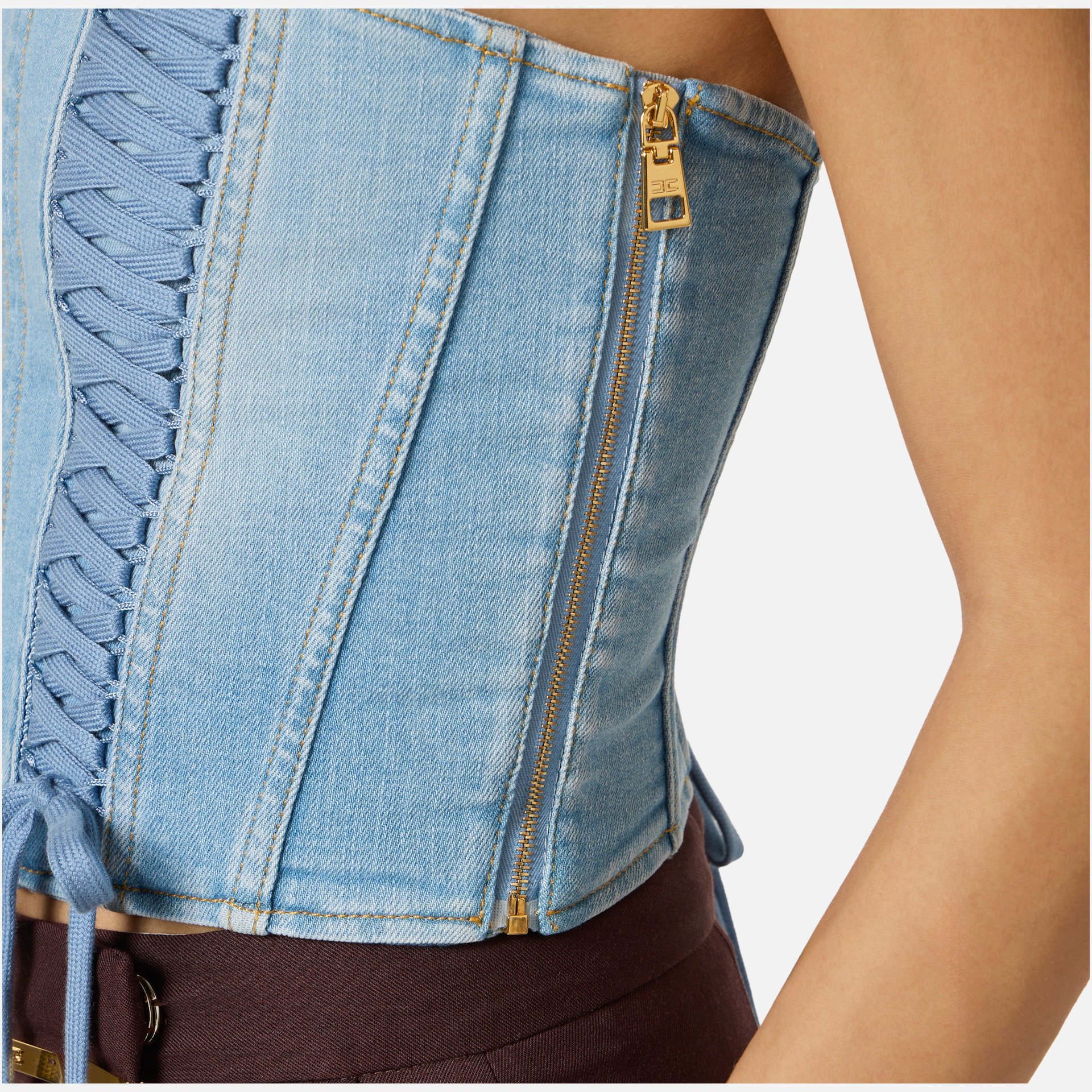Top Elisabetta Franchi – bustieră din denim cu design modern și îndrăzneț, ideală pentru ținute statement. Șireturile încrucișate adaugă un plus de stil și accentuează silueta, oferind un look contemporan și feminin.