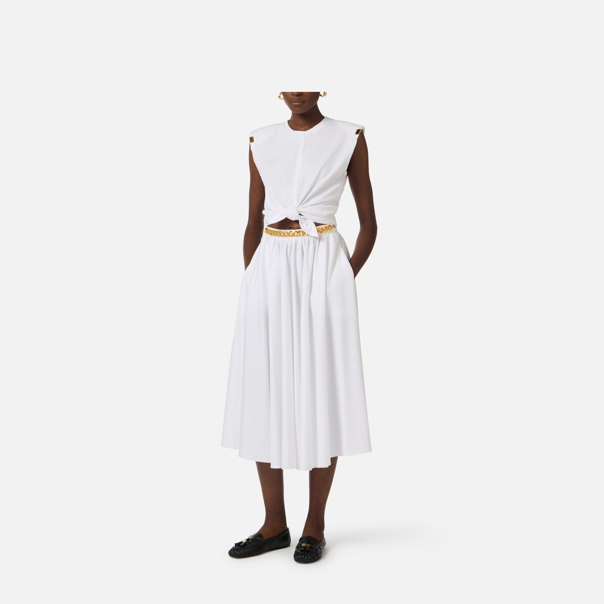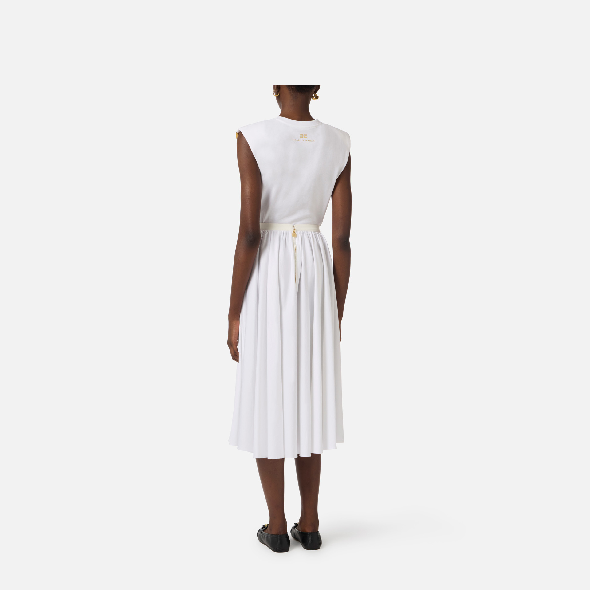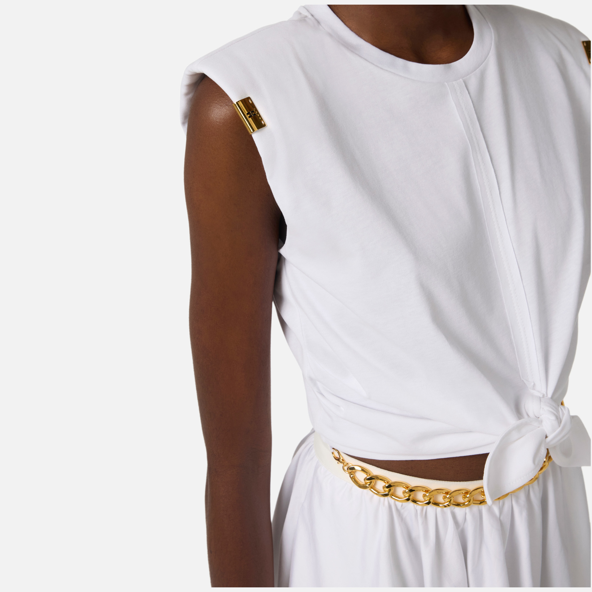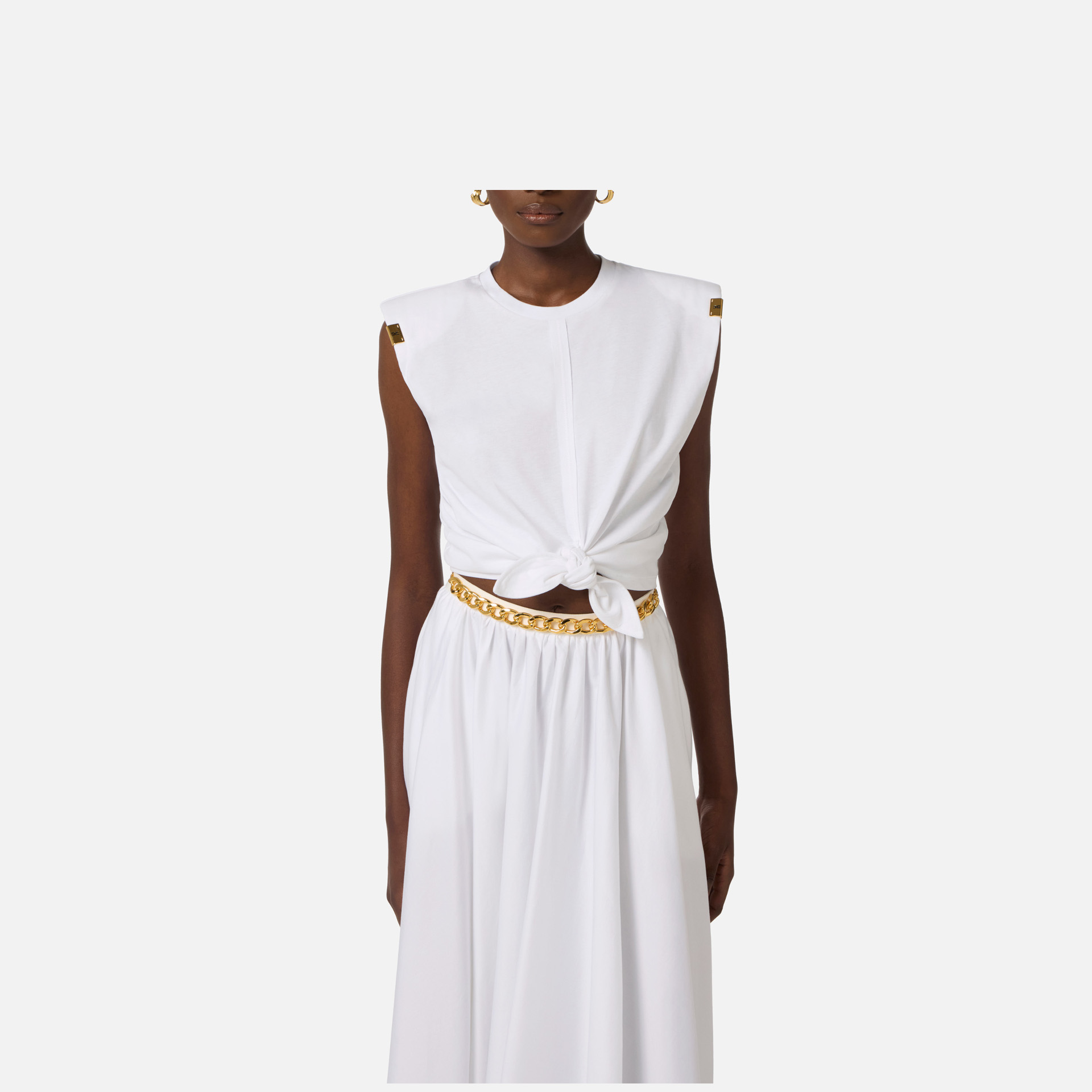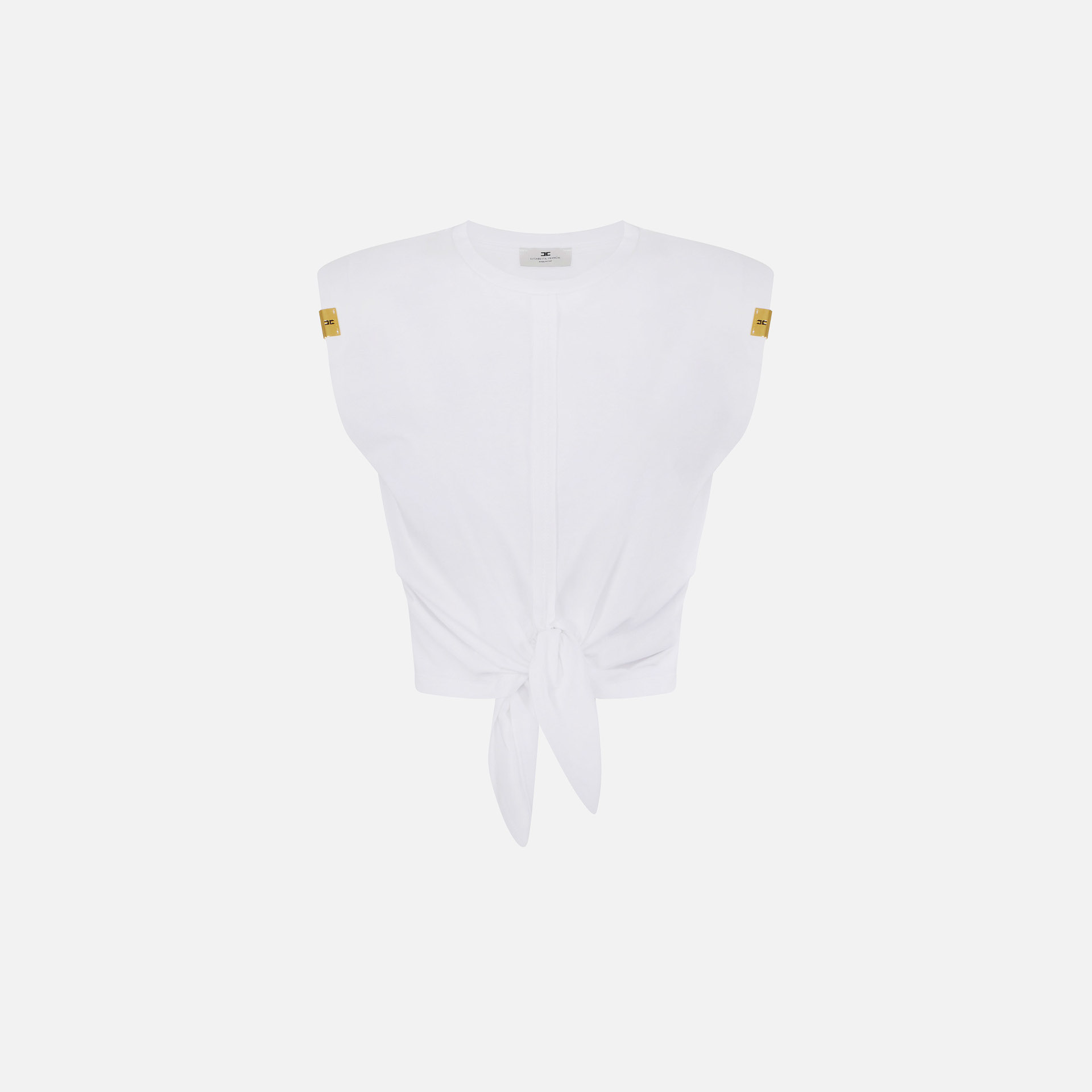 Tricou Elisabetta Franchi – tricou scurt din bumbac cu design modern și accente elegante, perfect pentru ținute casual cu stil. Umerii structurați și logo-ul metalic auriu adaugă un plus de personalitate și rafinament.