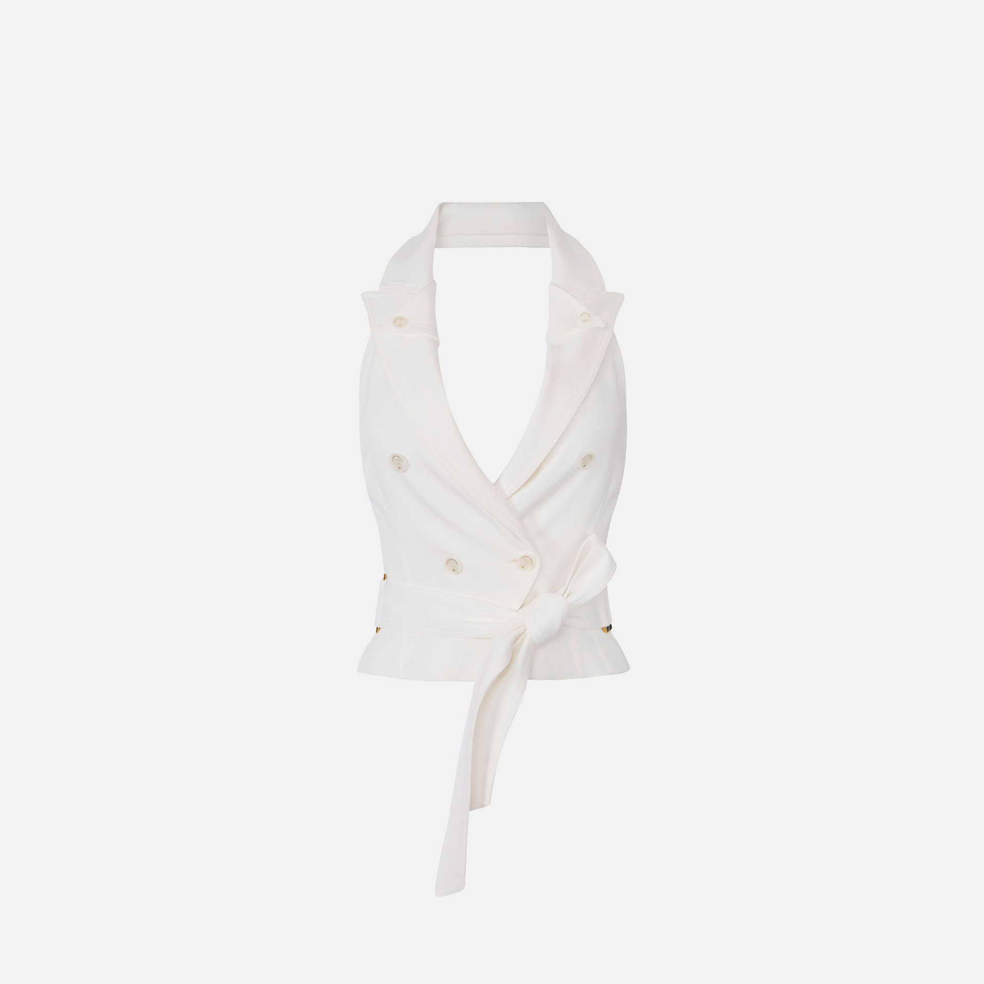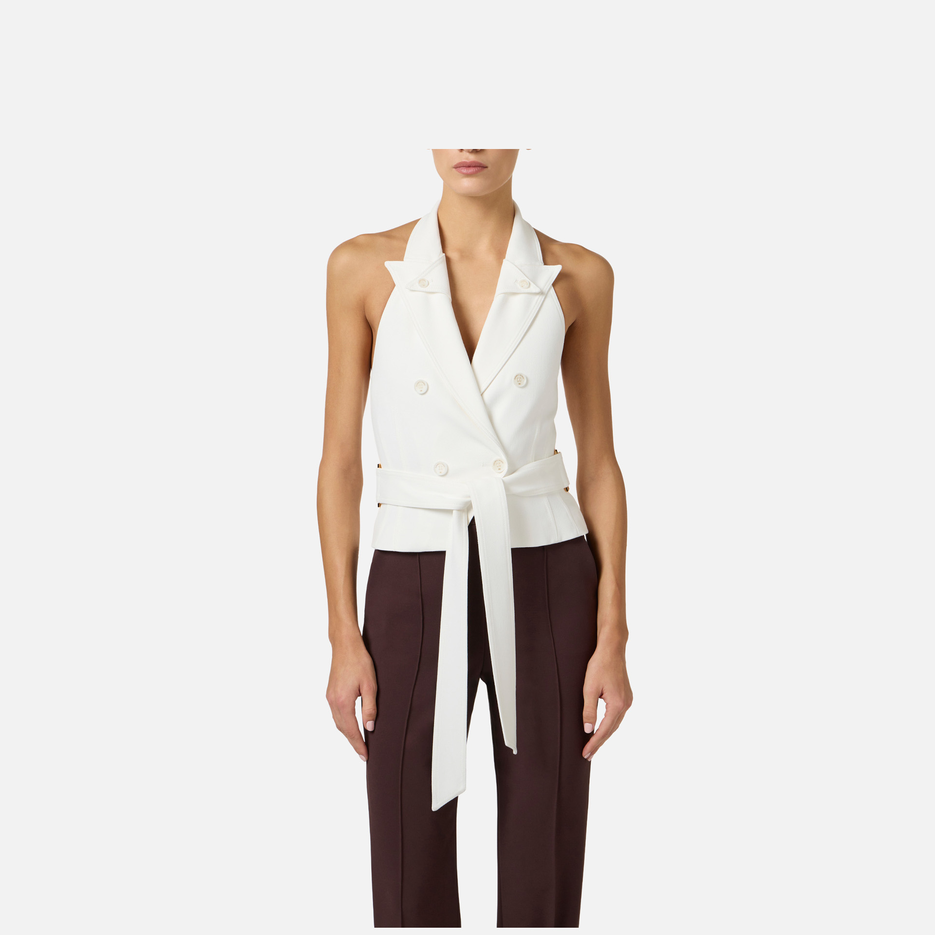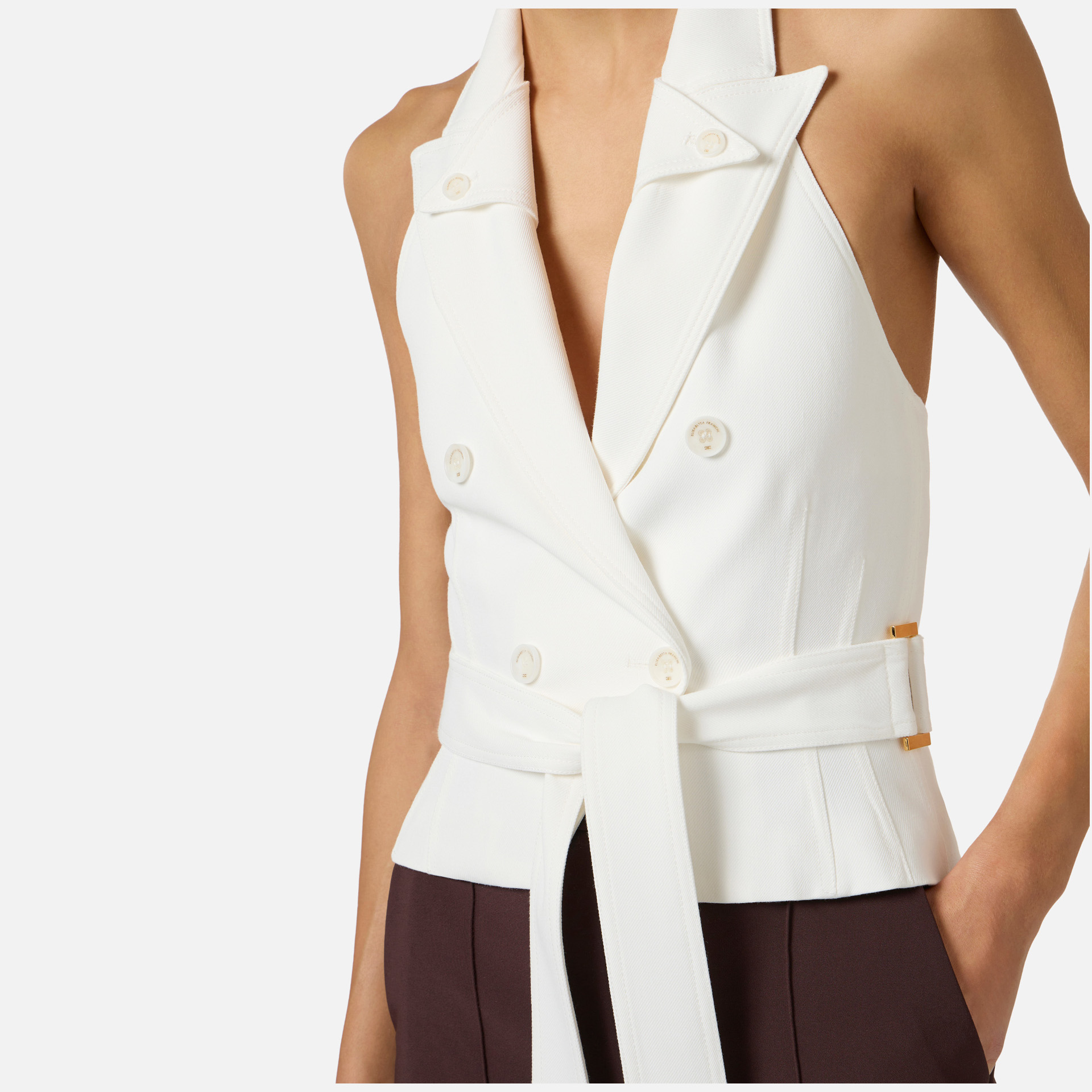 Vestă Elisabetta Franchi – vestă din gabardină cu design sofisticat și modern, ideală pentru ținute elegante cu un aer contemporan. Gulerul tip halter cu rever dublu și eșarfa în talie conturează o siluetă feminină și rafinată.